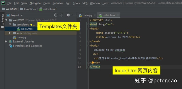 如果这样运行,pycharm终端会提示报错,因为找不到index.html文件。flask框架在使用这个模板函数时,默认去寻找项目文件夹下的templates文件夹里的html文件。因此我们需要先新建一个templates文件夹,然后在里面新建一个html文件,项目结构及内容参考如下: