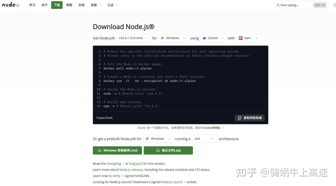 1安装Node.js 24.4.1下载页面(https://nodejs.org/zh-cn/download),选择 Windows 版下载并安装[2]