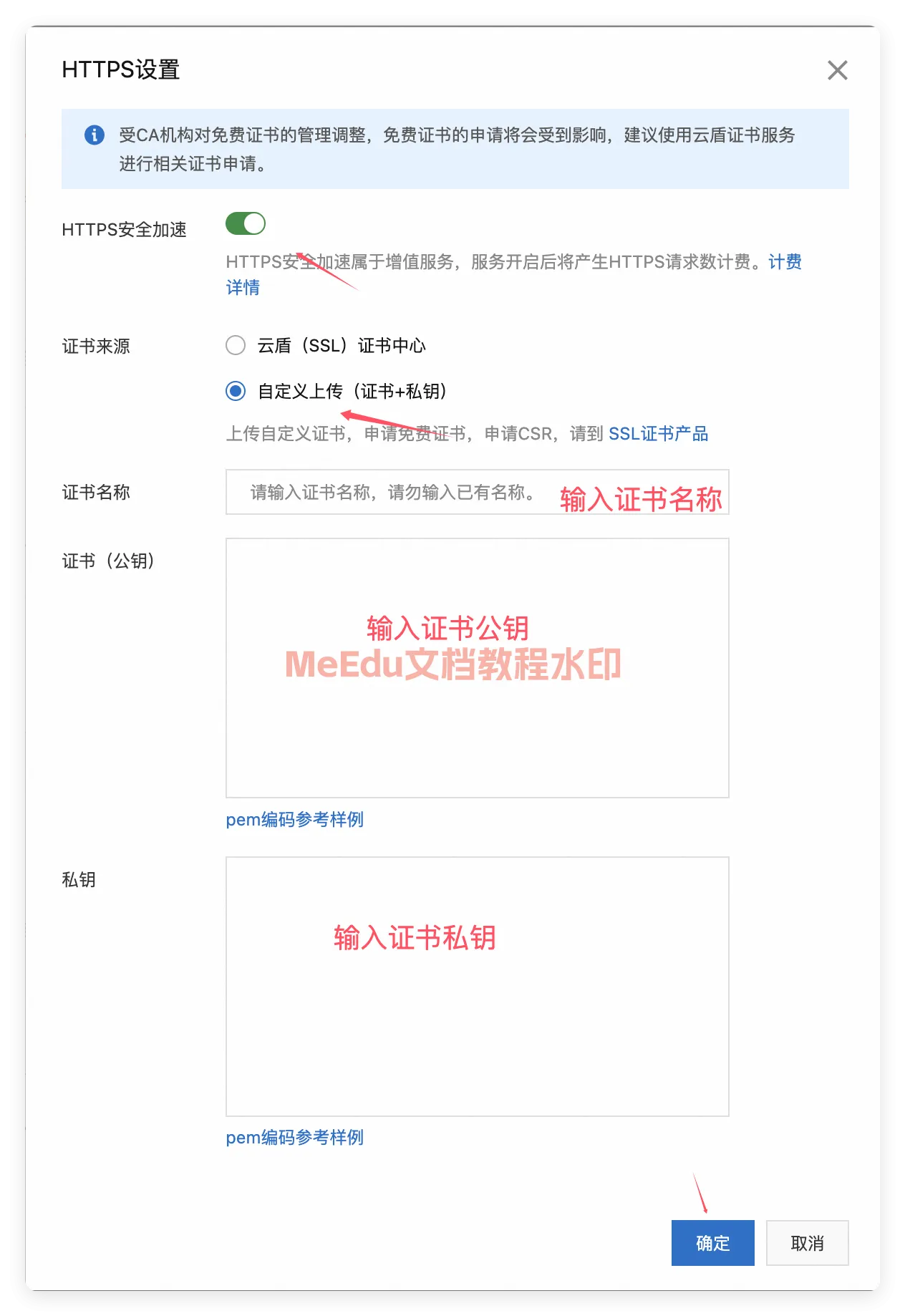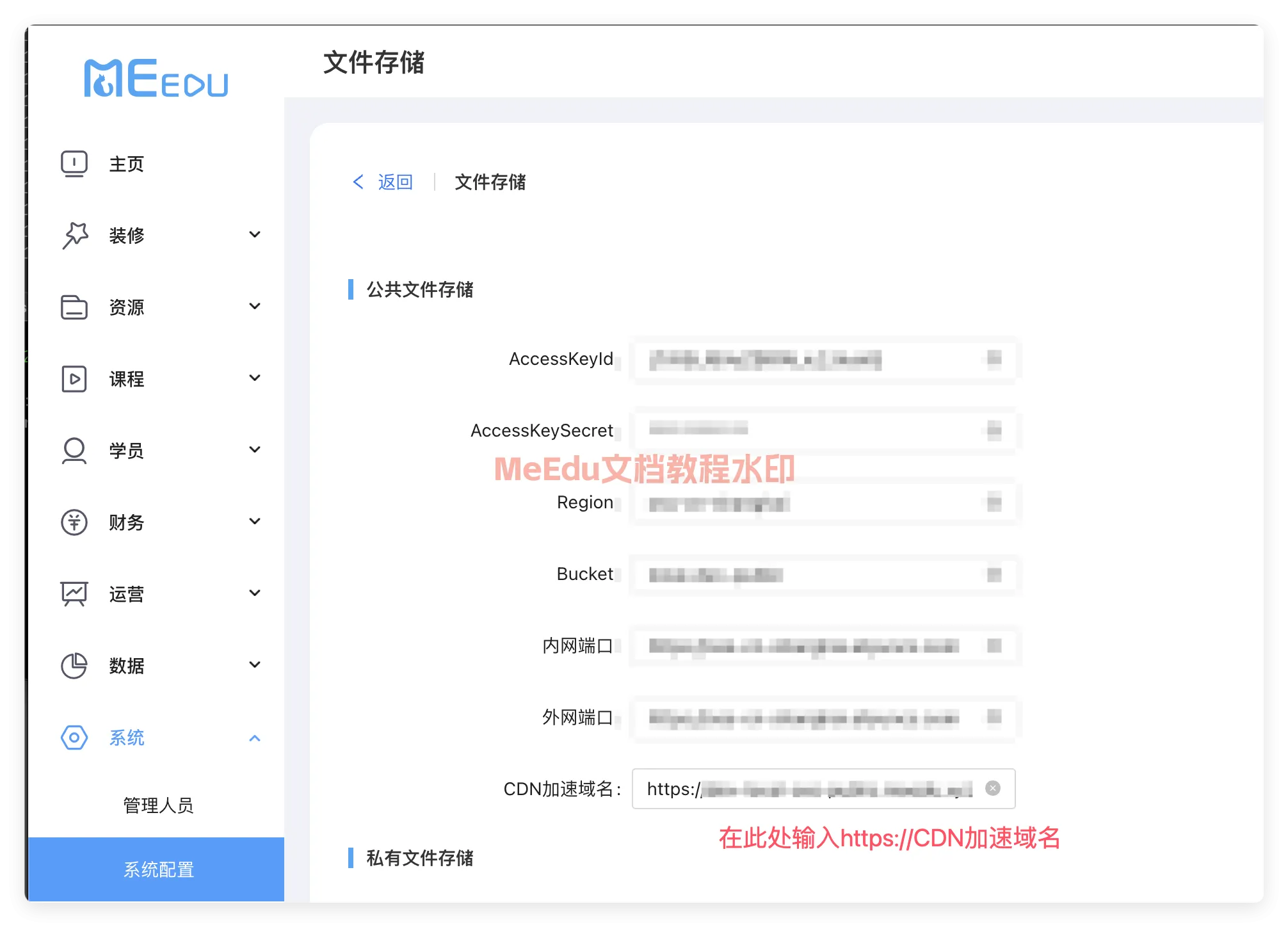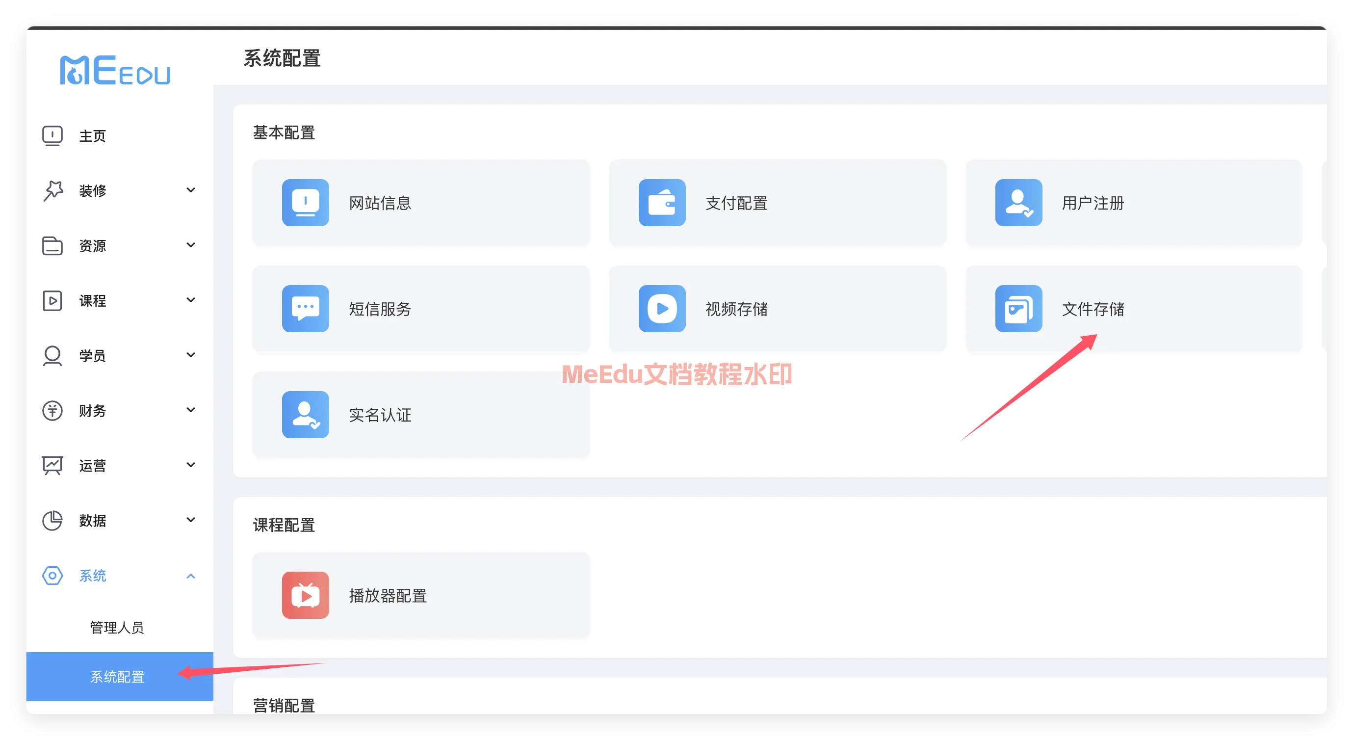 进入 meedu 后台,选择系统配置-文件存储配置,如下图: