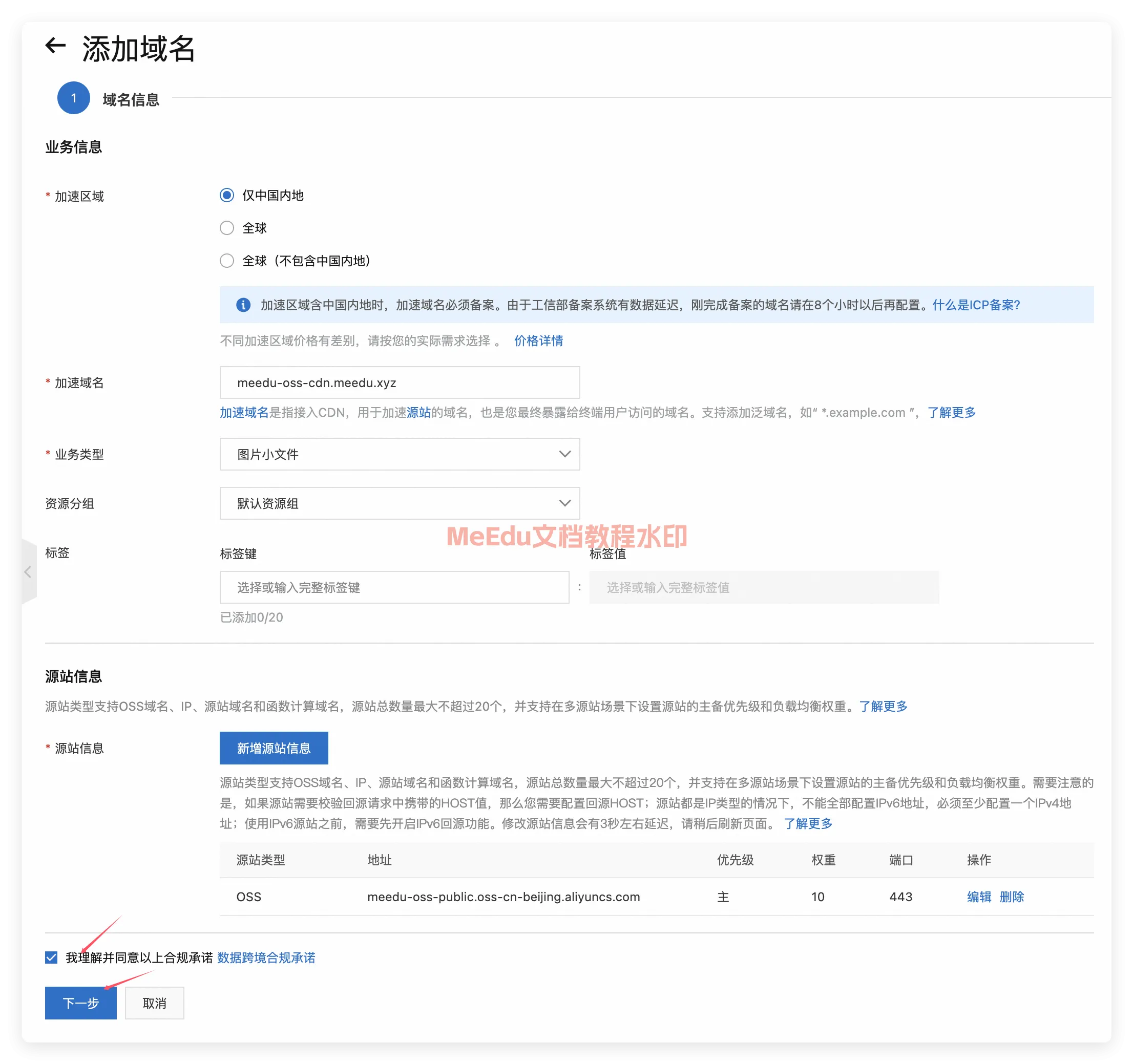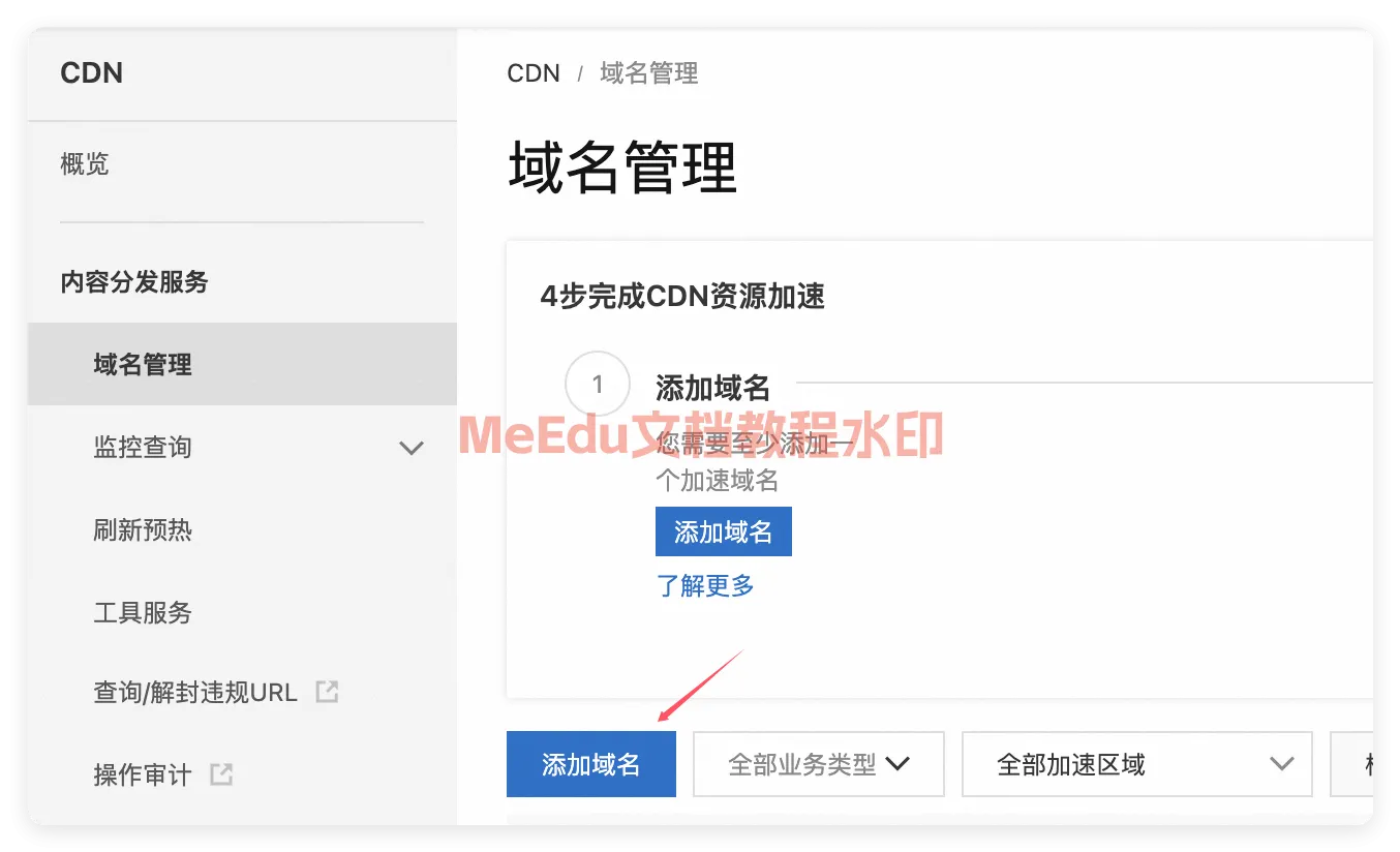 浏览器打开 https://cdn.console.aliyun.com/domain/list 点击添加域名按钮,如下图: