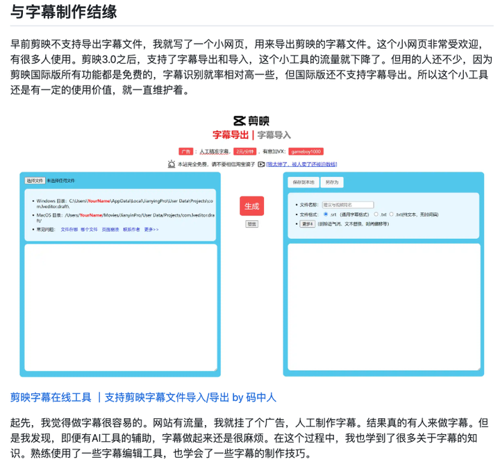 作者做这个网站的初衷也是为了解决 早期剪映不支持自动导出字幕文件的功能