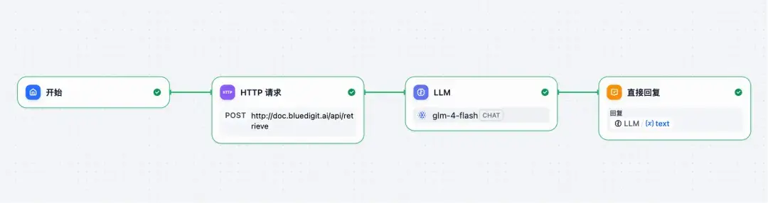 随后,我们在开始与 LLM 这两个节点间,增加一个 HTTP请求 节点,这样,我们就创建一个最简单的RAG工作流。