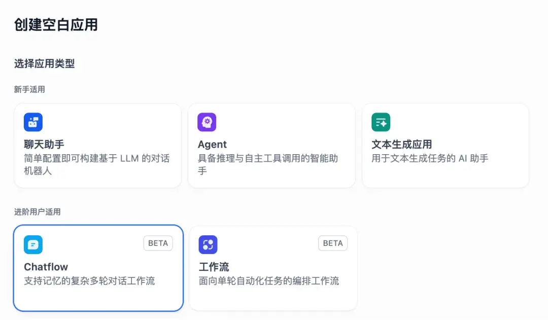 在 Dify工作室,我们选择创建空白应用,然后选择 Chatflow。