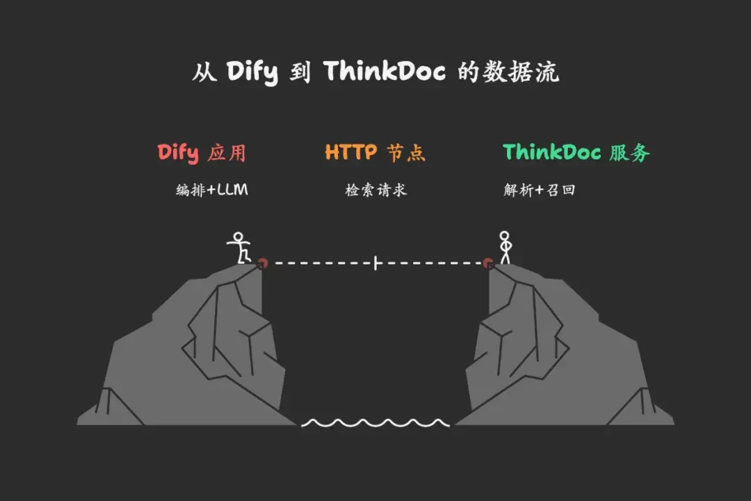 在企业级应用需求的场景下,我们采用 Dify 的编排与交互能力,将解析与检索环节外接至 ThinkDoc 知识库,通过 HTTP 直调 API 实现多模态精准召回。