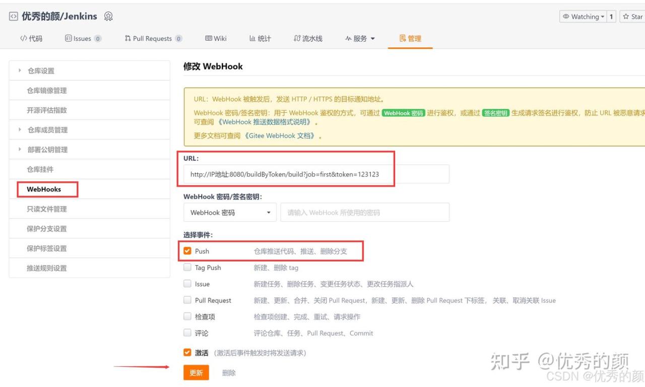 在代码仓库,找到WebHook,进行配置Jenkins回调地址,下图以Gitee为例。