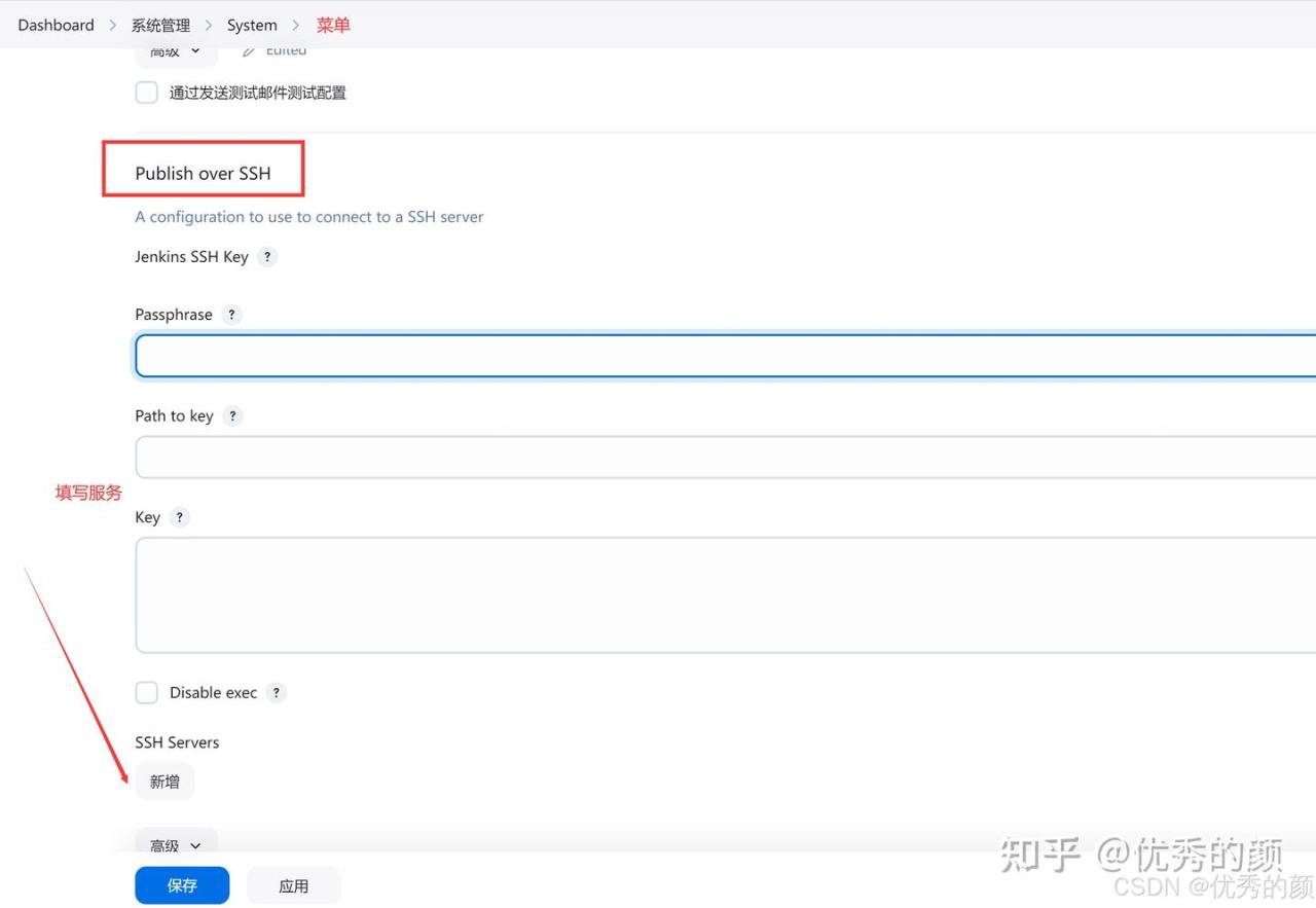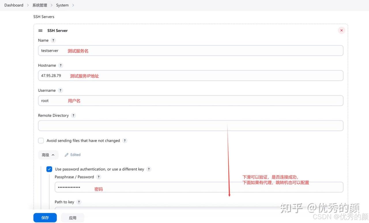 在全局系统配置,添加测试目标服务器,前提需要安装Publish Over SSH插件。