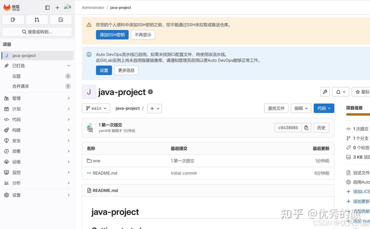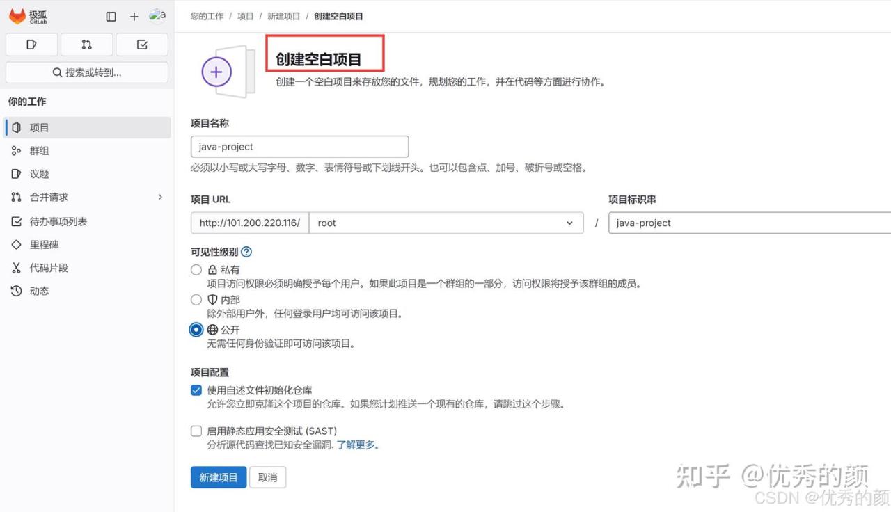 使用开发工具,进行创建新项目,进行提交代码,然后刷新GitLab页面