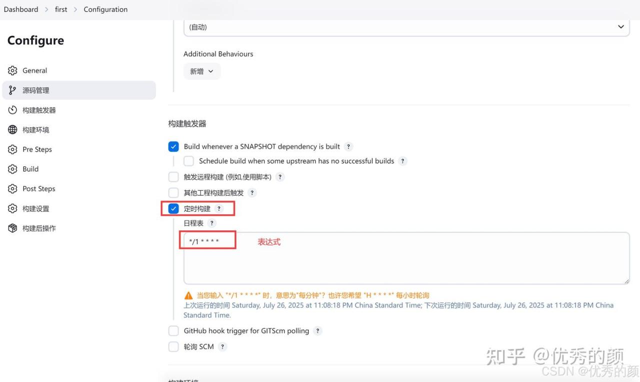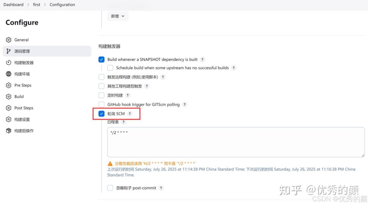 这个构建是由Jenkins主动发起的,会主动定期检查代码托管服务器上是否有变化,一旦发生变化执行任务构建。