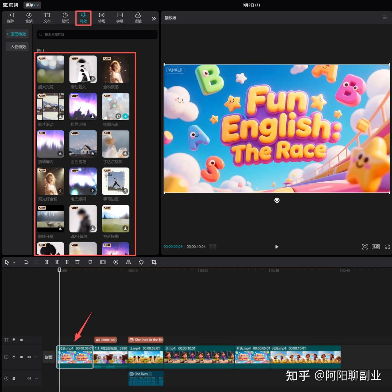 如果想让视频更酷炫一点,在选中视频素材的情况下,点击顶部菜单栏的”特效“,在下方列表里可以选择自己喜欢的特效,如图: