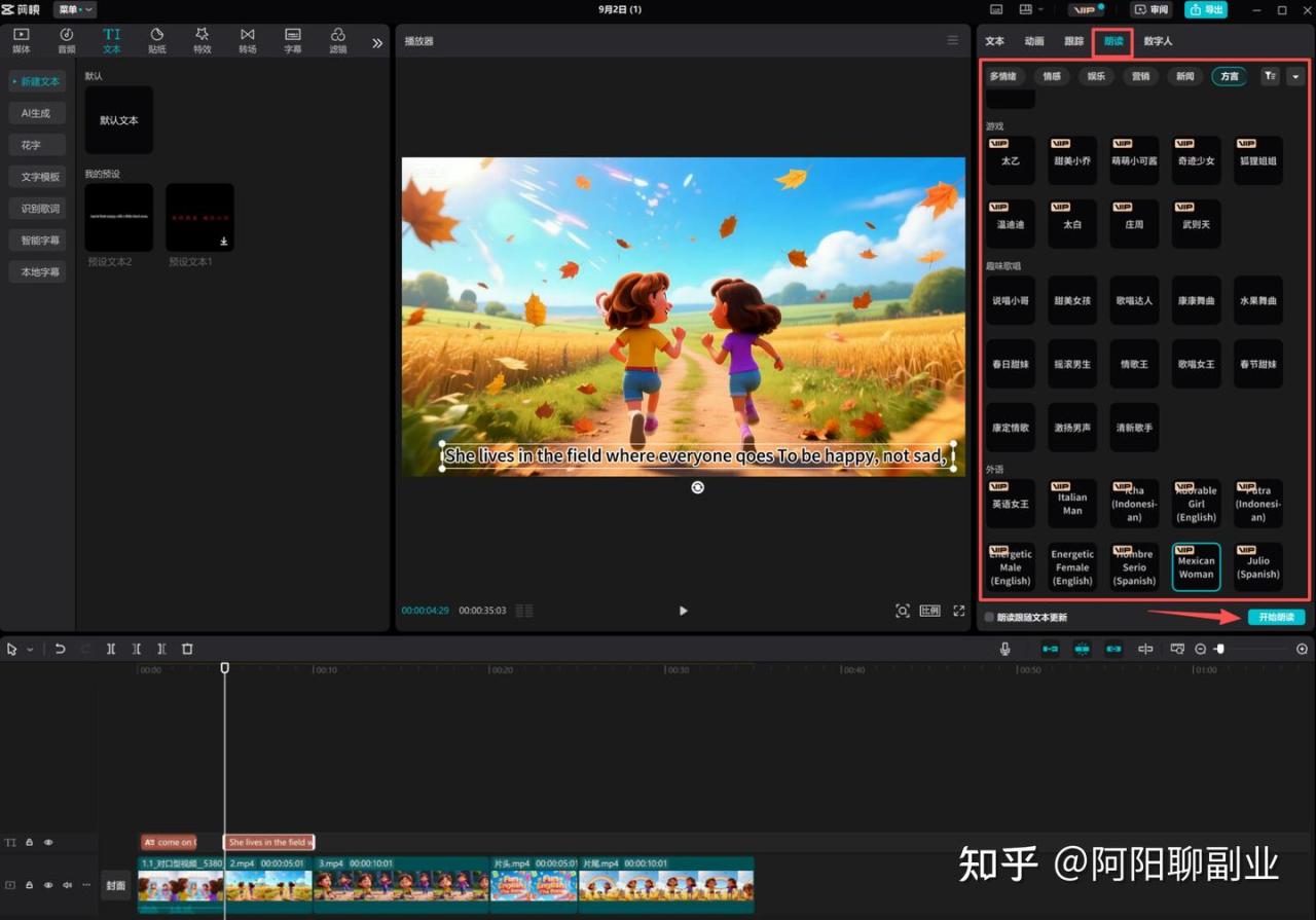 点击右侧属性面板的”朗读“选项,在下方列表里可以选择自己喜欢的配音角色,点击”开始朗读“按钮,如图: