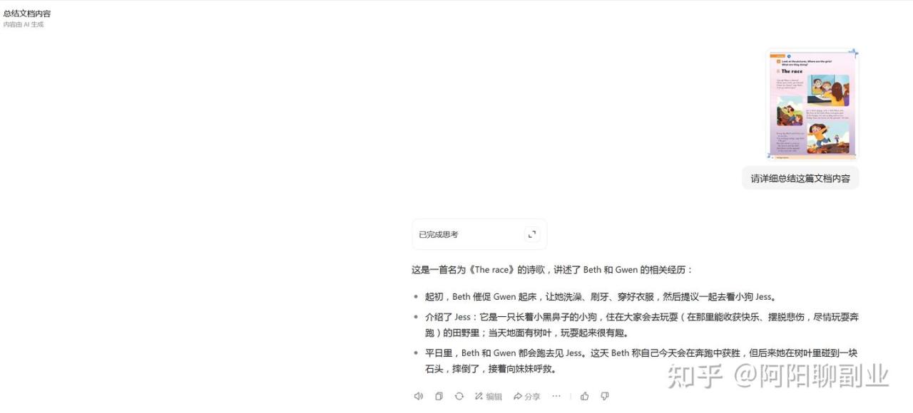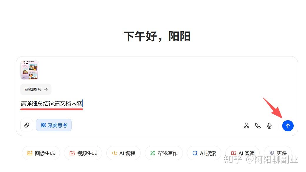接着输入提示词“请详细总结这篇文档内容”,点击“向上箭头”图标(发送)按钮,如图: