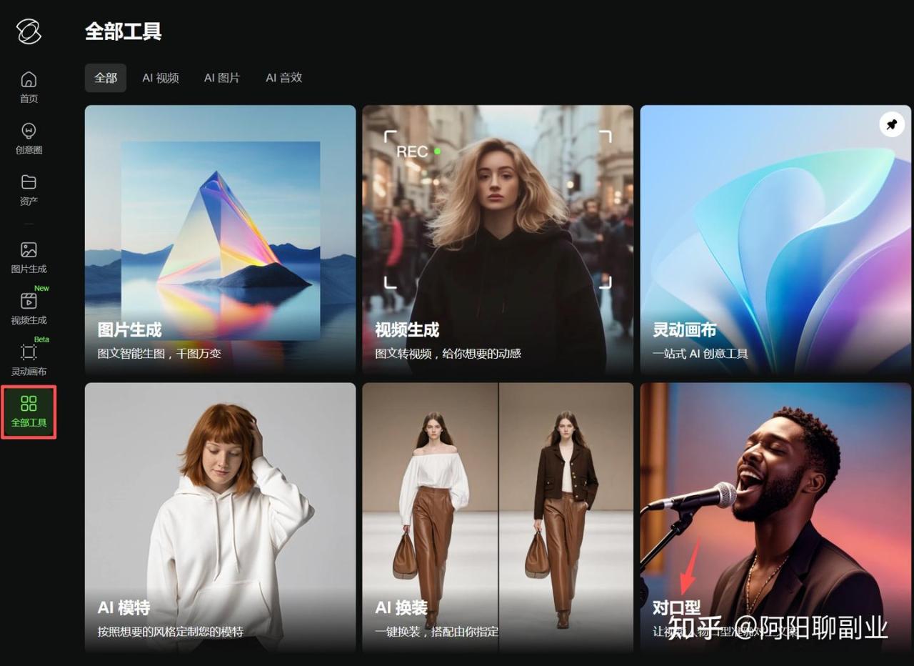 打开可灵平台https://app.klingai.com/cn/all-tools,点击左侧面板的“全部工具”接着点击右边面板的“对口型”选项,如图: