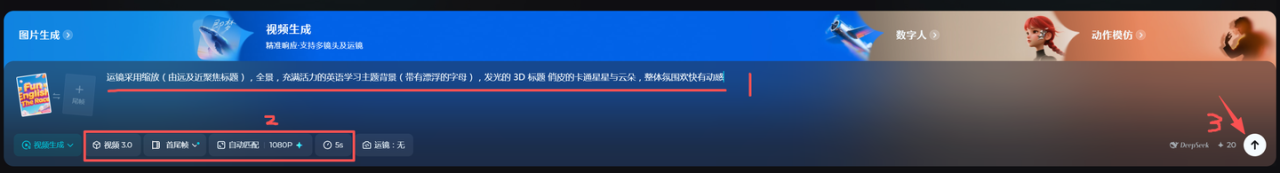 接在输入框里,再把豆包给的“视频提示词”贴进去 —— 比如片头视频提示词“运镜缩放(由远及近聚焦标题),全景,漂浮字母 + 发光 3D 标题,卡通星星云朵,氛围欢快”。,设置好分辨率(选1080P 足够用)和时长(每个片段 5-10 秒),点击“发送”,AI 就会自动让图片动起来。如图: