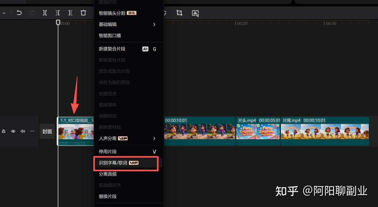 给视频添加字幕:点击选中某个视频,鼠标右键,在下拉菜单中,点击”识别字幕/歌词“,如图: