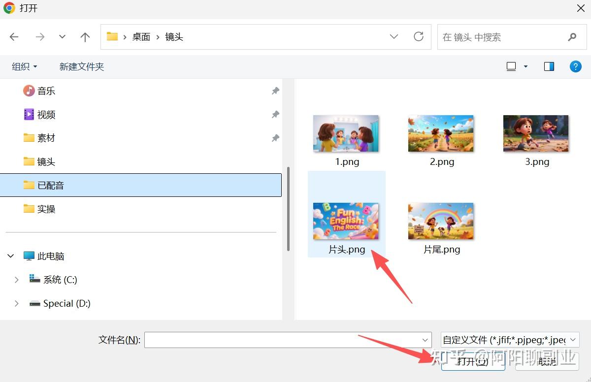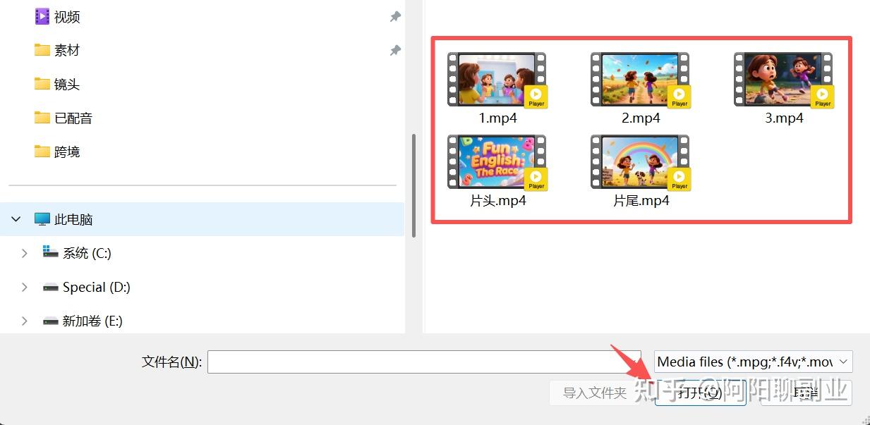 在弹出的窗口中,按住鼠标左键不动,可以框选全部视频素材,点击”打开“,如图: