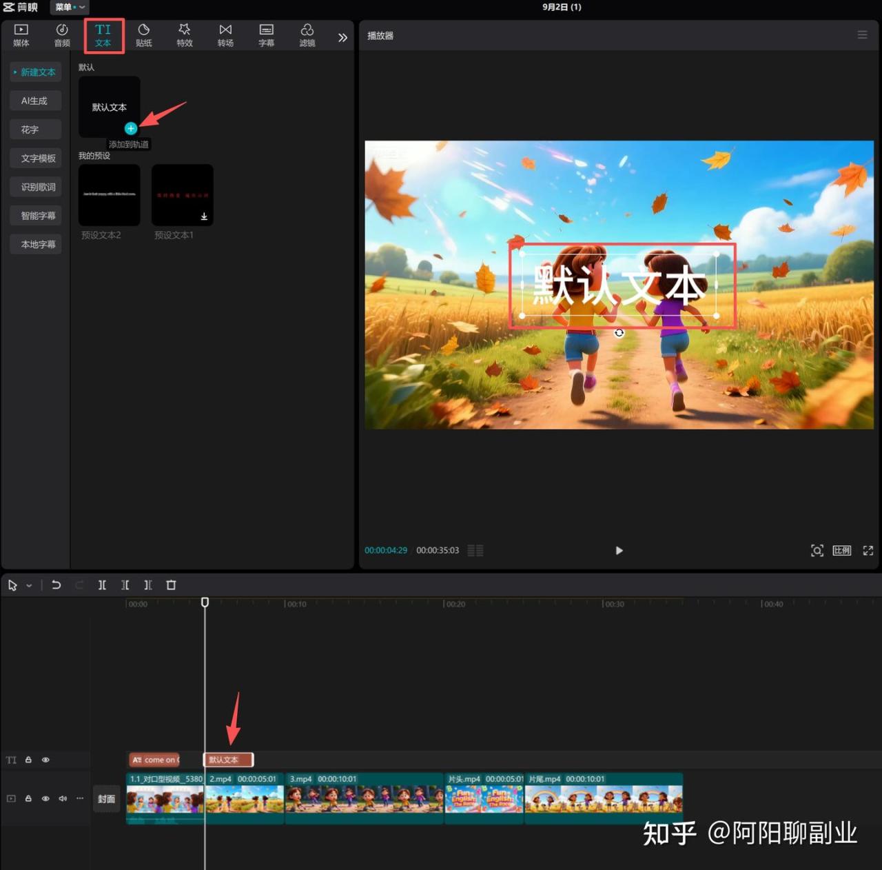 如果需要加解说配音,可以先点击顶部菜单栏”文本“,接着点击”+“号添加默认文本。如图: