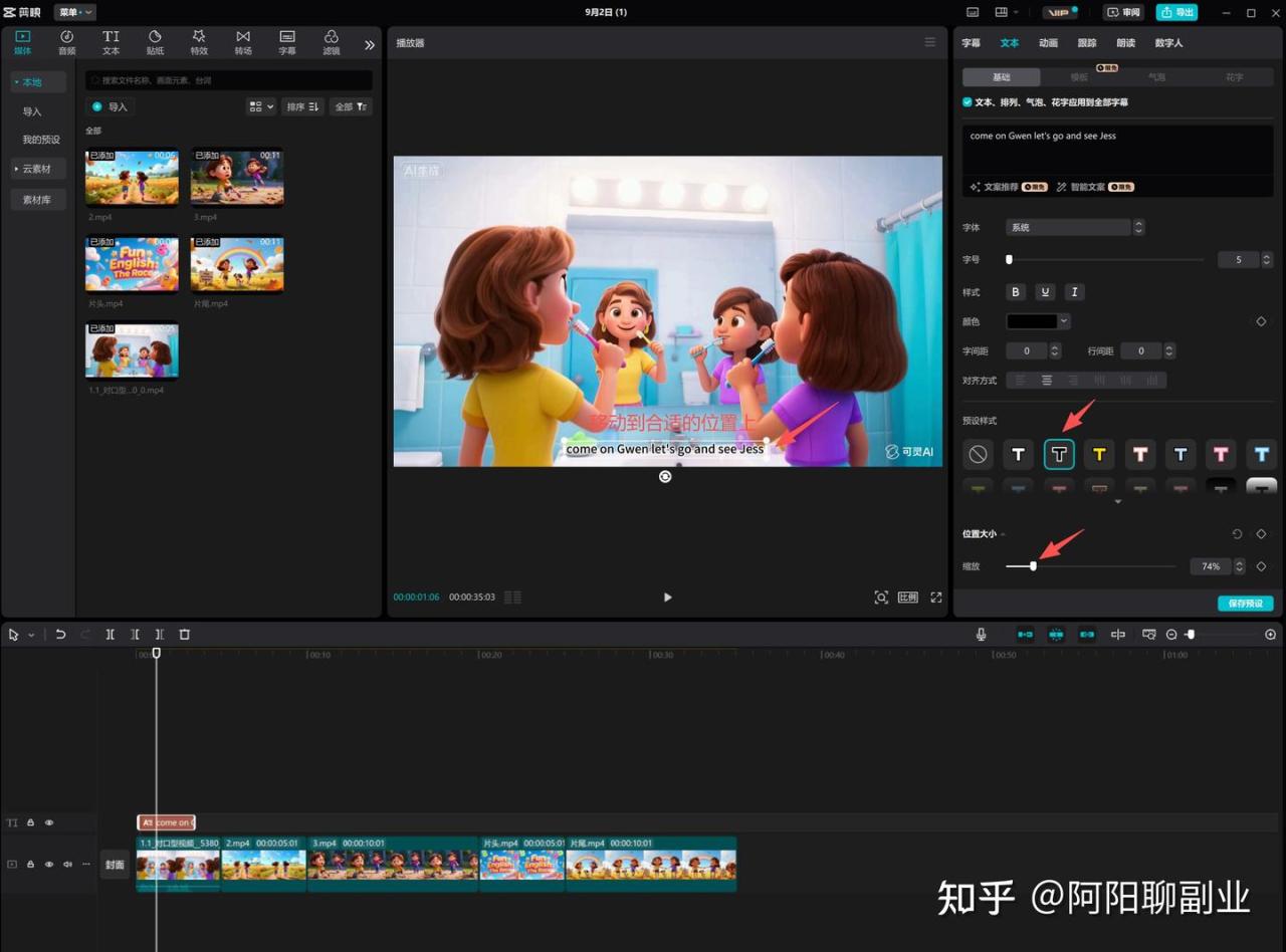 然后将字幕调整到合适的显示位置,并且可以点击右侧属性面板中的各项参数,比如预设样式,滑动位置大小的缩放条,可以调节字体大小等,如图: