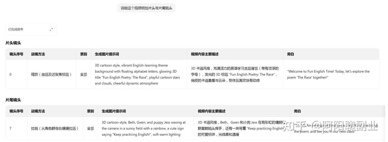 有了镜头内容后,我们还需要给短视频增加片头与片尾,继续输入提示词:请给这个视频增加片头与片尾镜头
