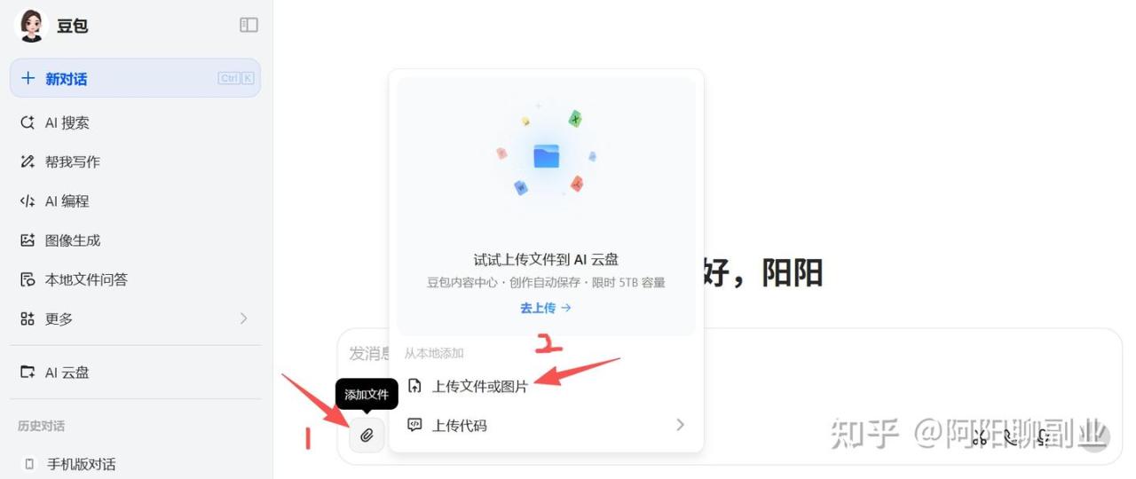 打开豆包,点击“回形针”图标(添加文件),在弹出的窗口中,点击“上传文件或图片”,如图: