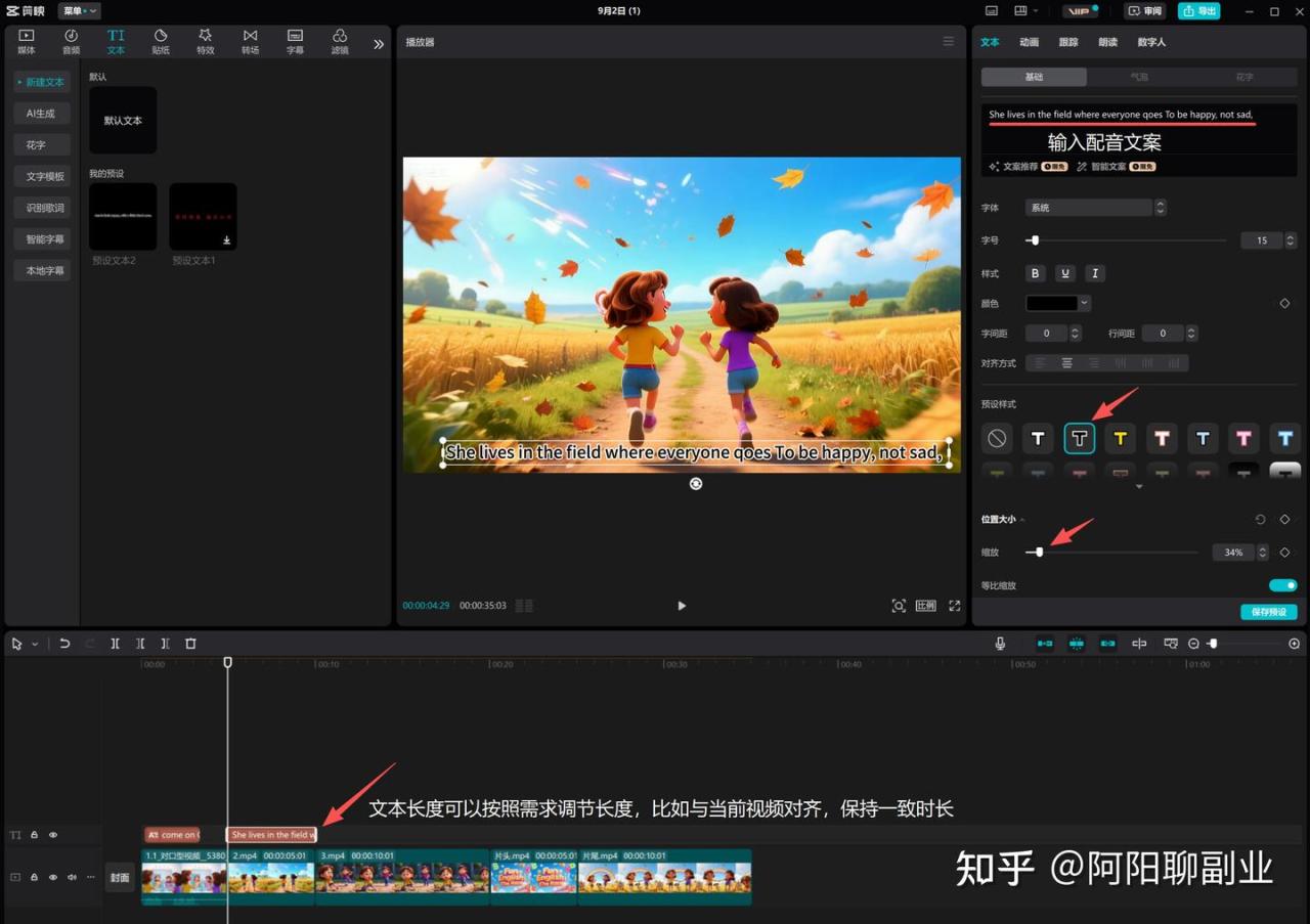 在文本输入框内填写需要配音的文案,同样可以点击右侧属性面板中的各项参数,比如预设样式,滑动位置大小的缩放条,可以调节字体大小等,如图: