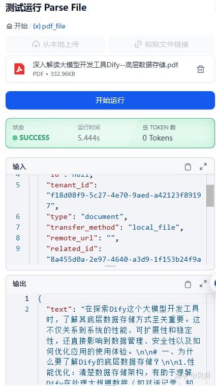 在Dify中新建一个应用,增加授权成功后的MinerU节点,然后上传一个文件,如下图:
