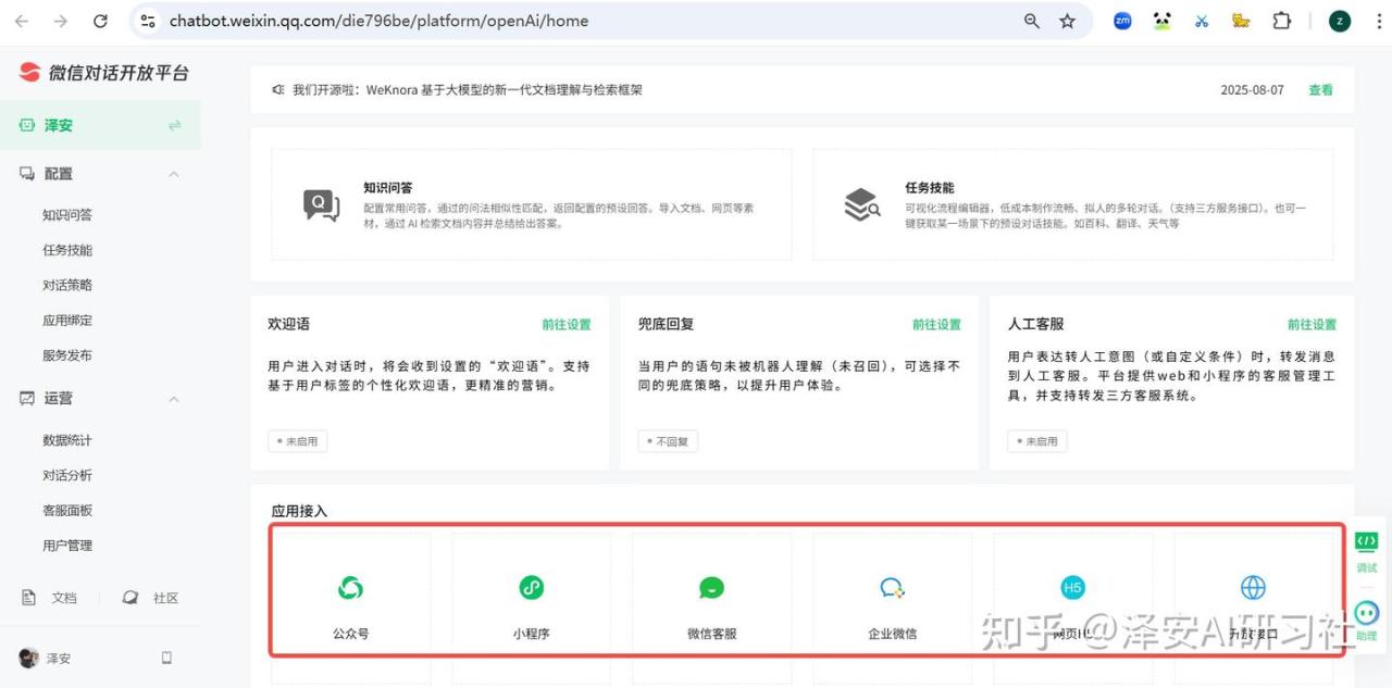 除了本地部署外,还支持在线版的对话平台,这个平台可以无缝对接到公众号,小程序,企业微信,微信客服等接口