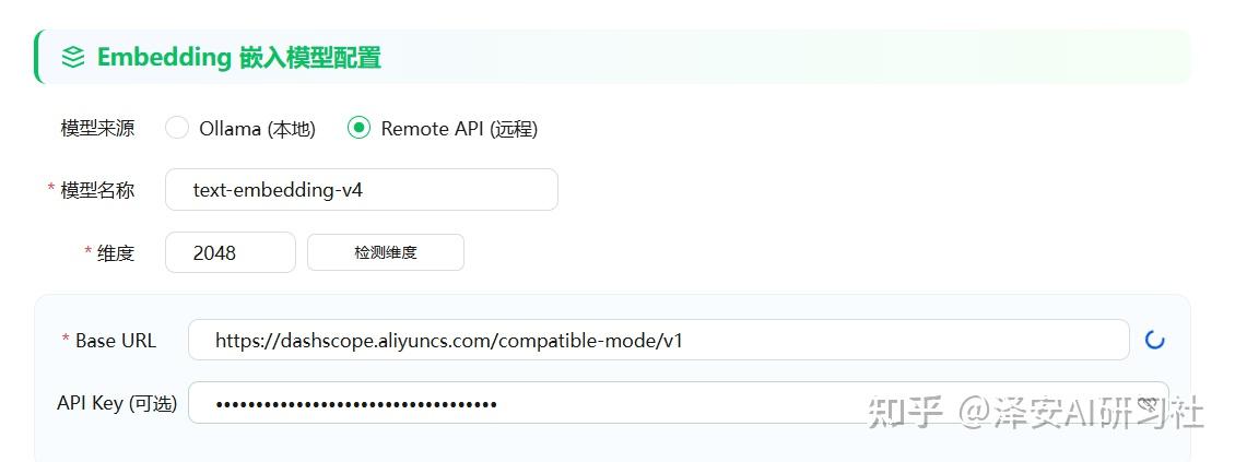 配置 Embedding 嵌入模型, 这里我用的是阿里云的 text-embedding-v4,2048 的维度;