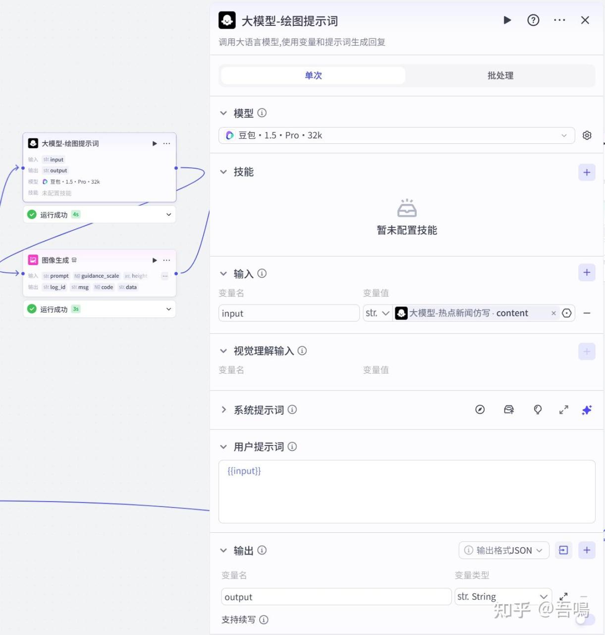 这部分内容用于生成文章的封面图片,首先大模型先根据新文章的内容生成图片绘制的提示词,然后再通过图像生成的插件生成图片。