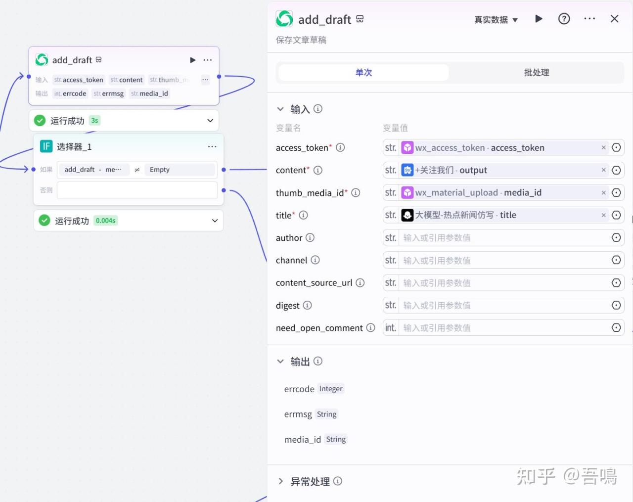 这个节点用于发布文章到剪印草稿箱,使用到了【微信公众号API】插件的【add_draft】工具。