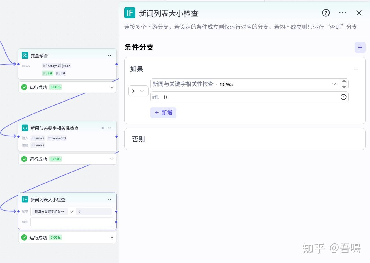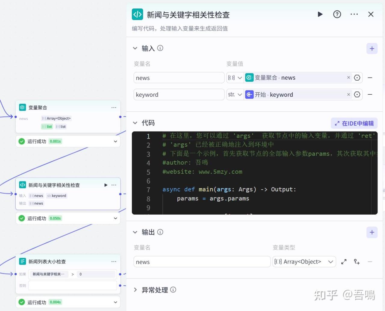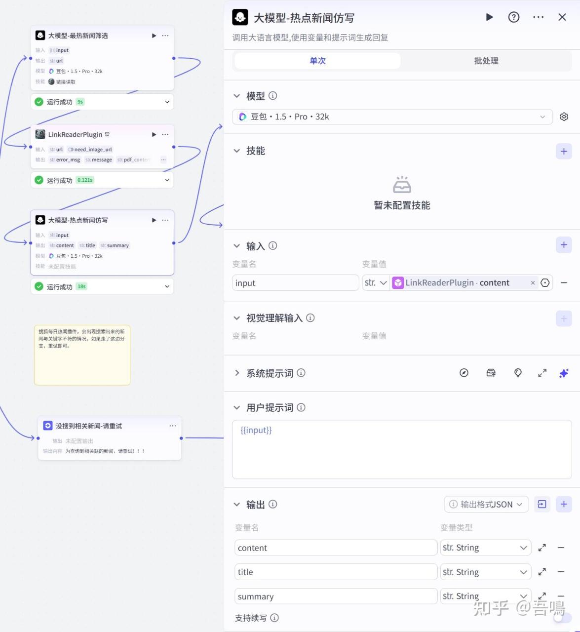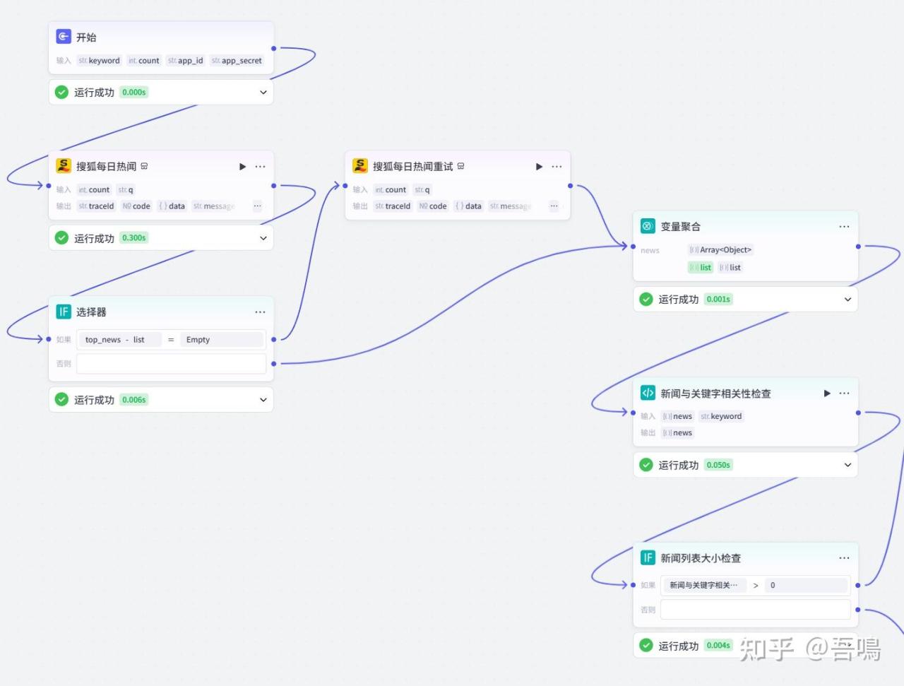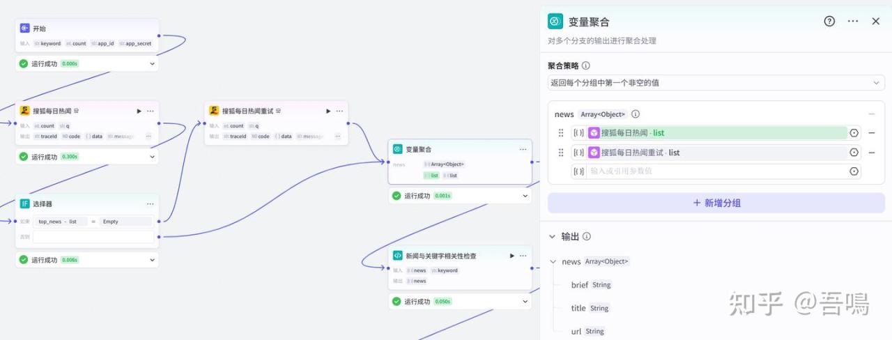 在测试过程中也发现【搜狐热闻】插件,偶发性的会出现搜出来的新闻和输入的关键字不符的情况,所以这部分的节点也对搜索出来的新闻与关键字进行了相关性检查,增加工作流的稳定性。