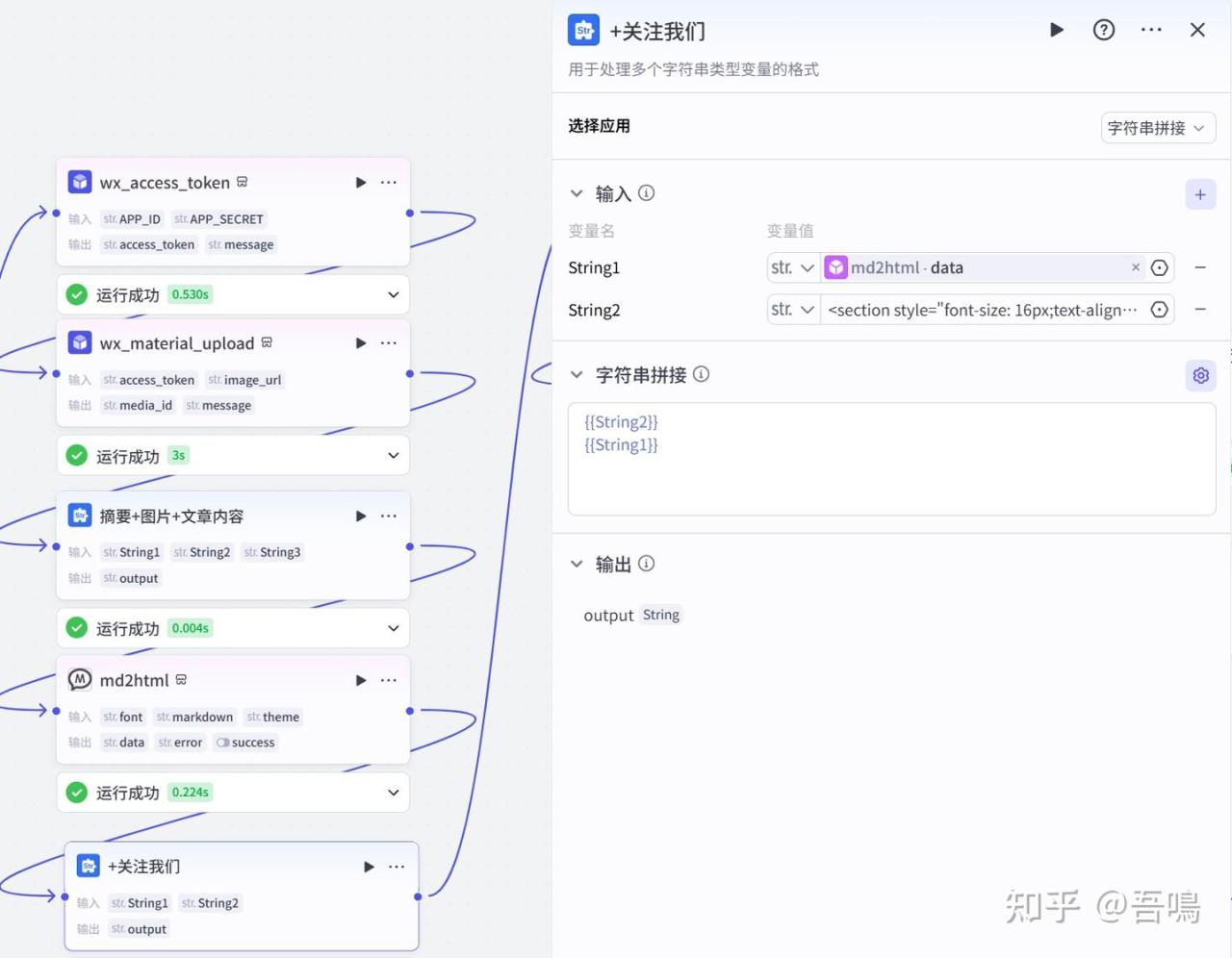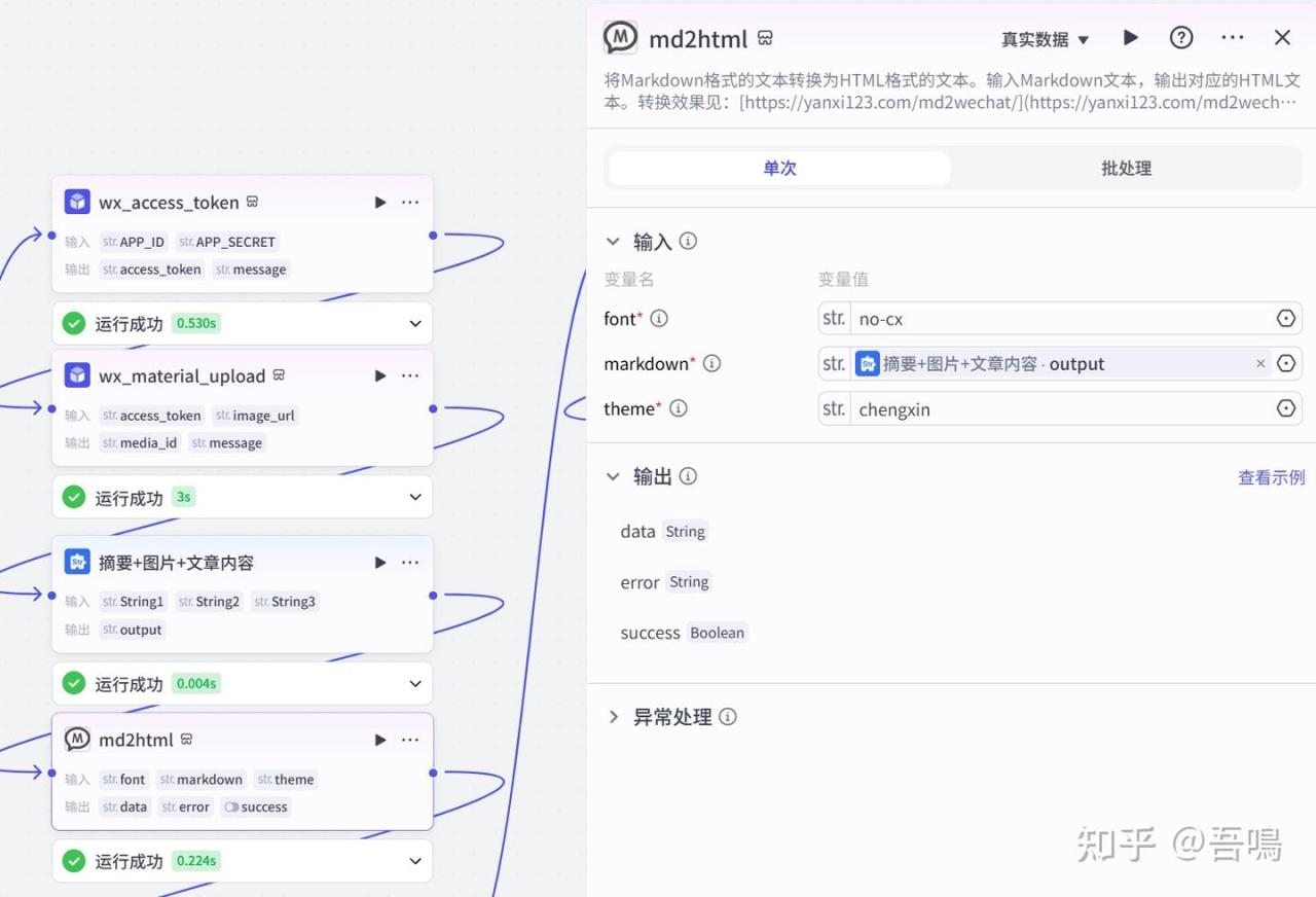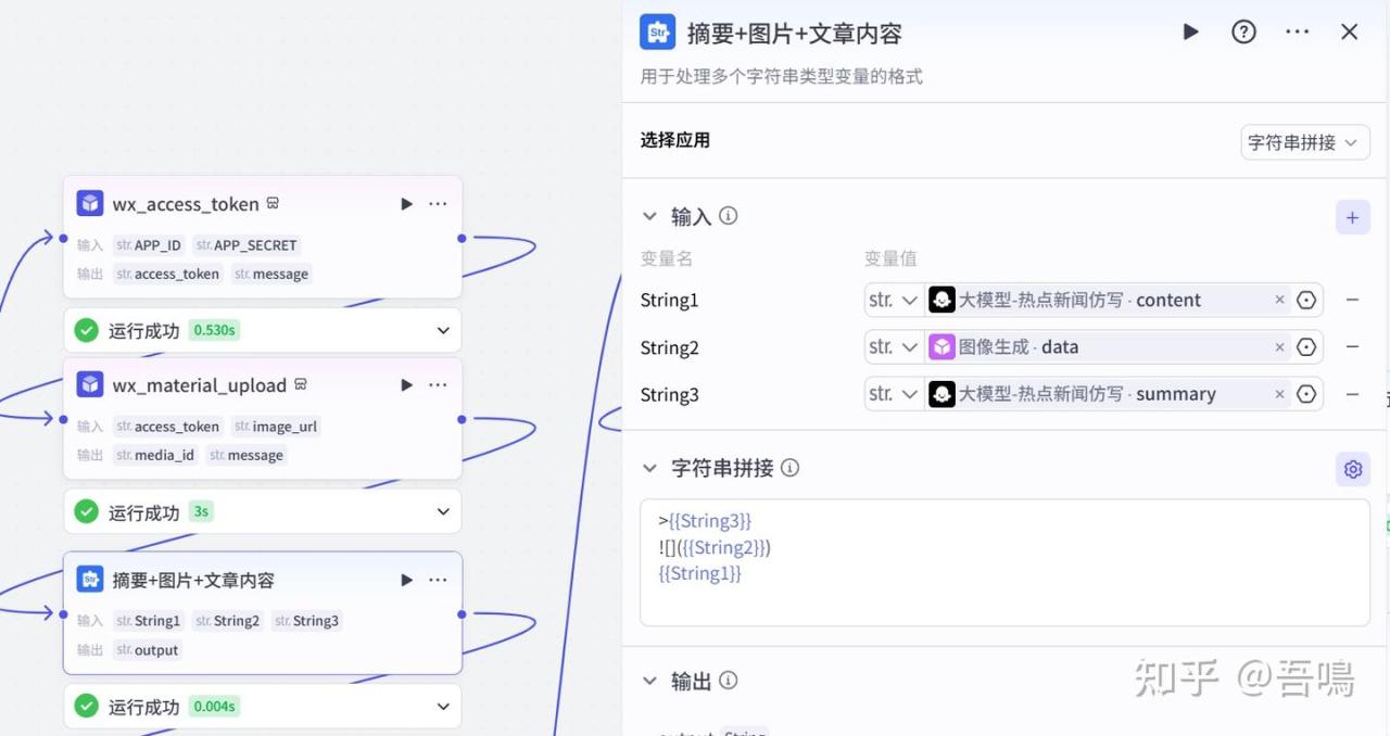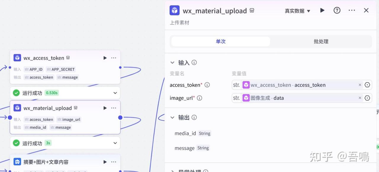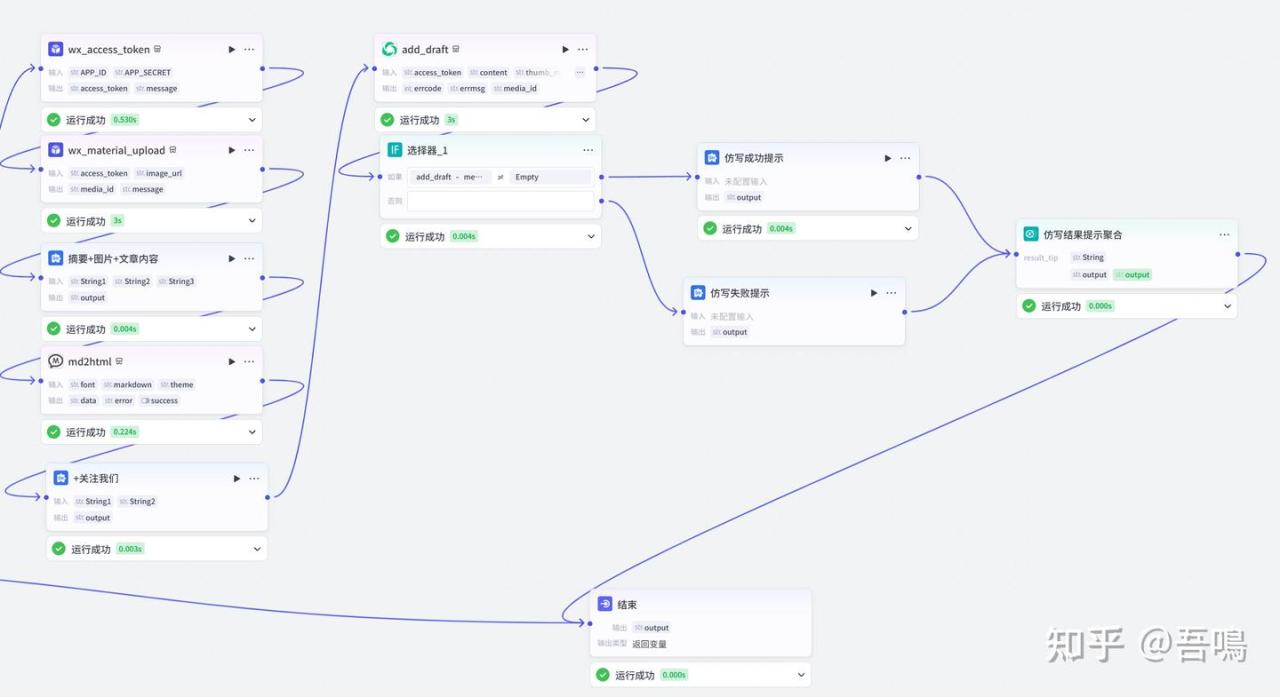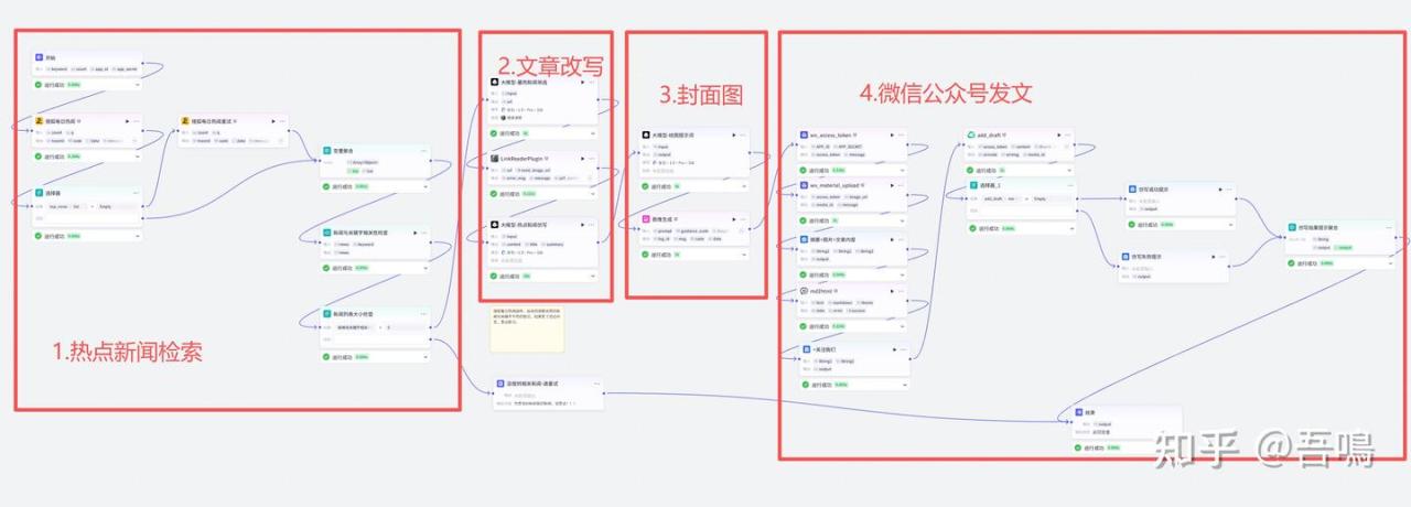 这部分的流程节点用于公众号文章排版、素材上传、文章发布这几个作用,使用到的节点插件较为简单。