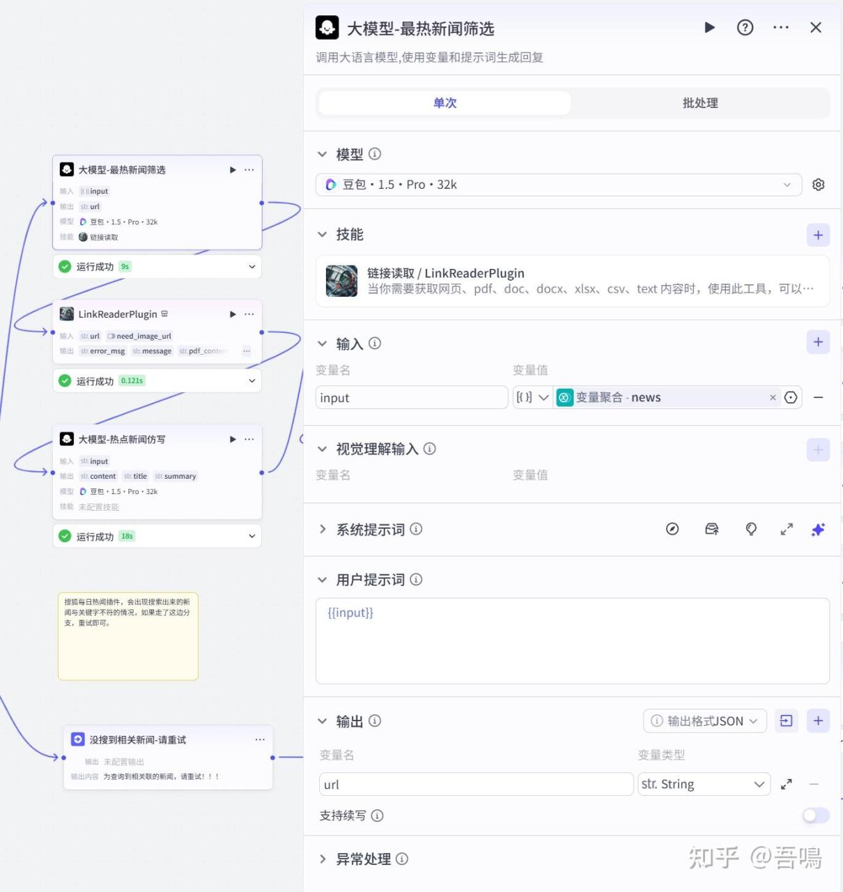 这部分的流程用于判断新闻列表中最热的是哪一篇文章,然后读取最热的文章的内容,让大模型根据最热的文章的内容进行改写。下面对这部分的节点做下详细的解读。