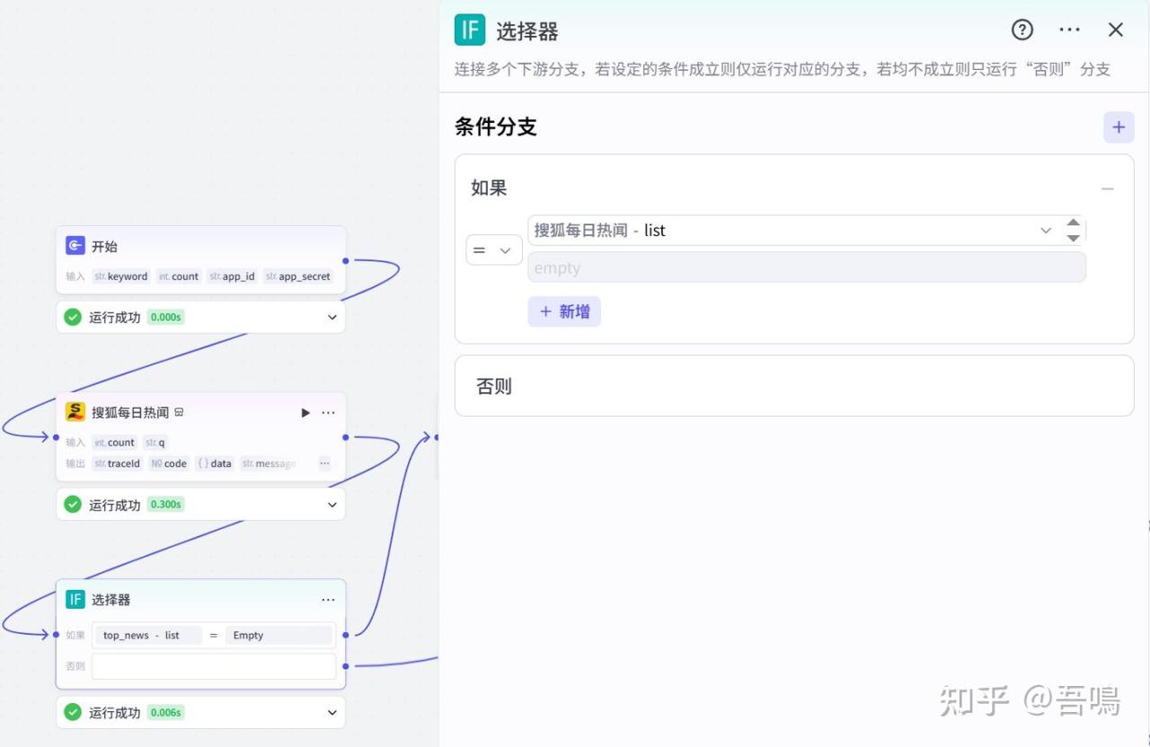 这个节点用于判断【搜狐新闻】插件查找出来的结果,是否与输入的关键字相吻合,不吻合则直接结束,不浪费后面大模型的token。
