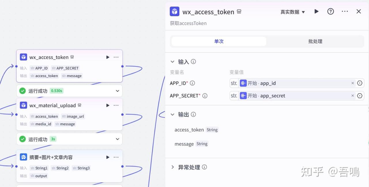 获取微信公众号API认证,用于后续的接口调用。使用到了【微信公众号助手】插件的【wx_access_token】工具。