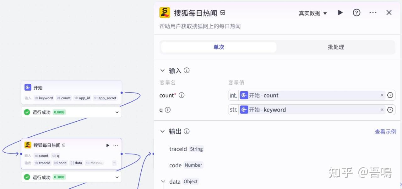 这个节点使用到了扣子的【搜狐热闻】插件的【top_news】工具,用于搜索搜狐热点。