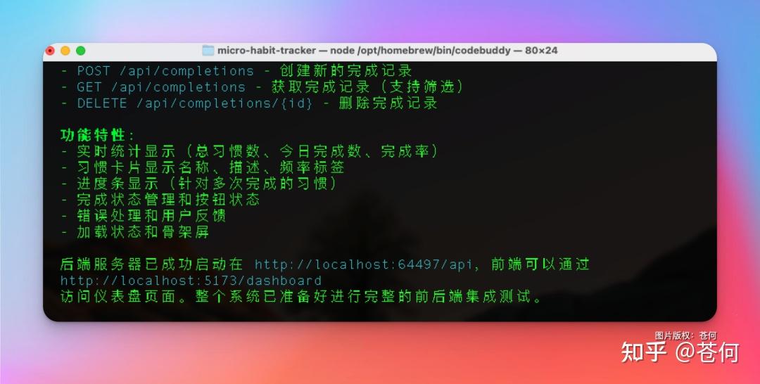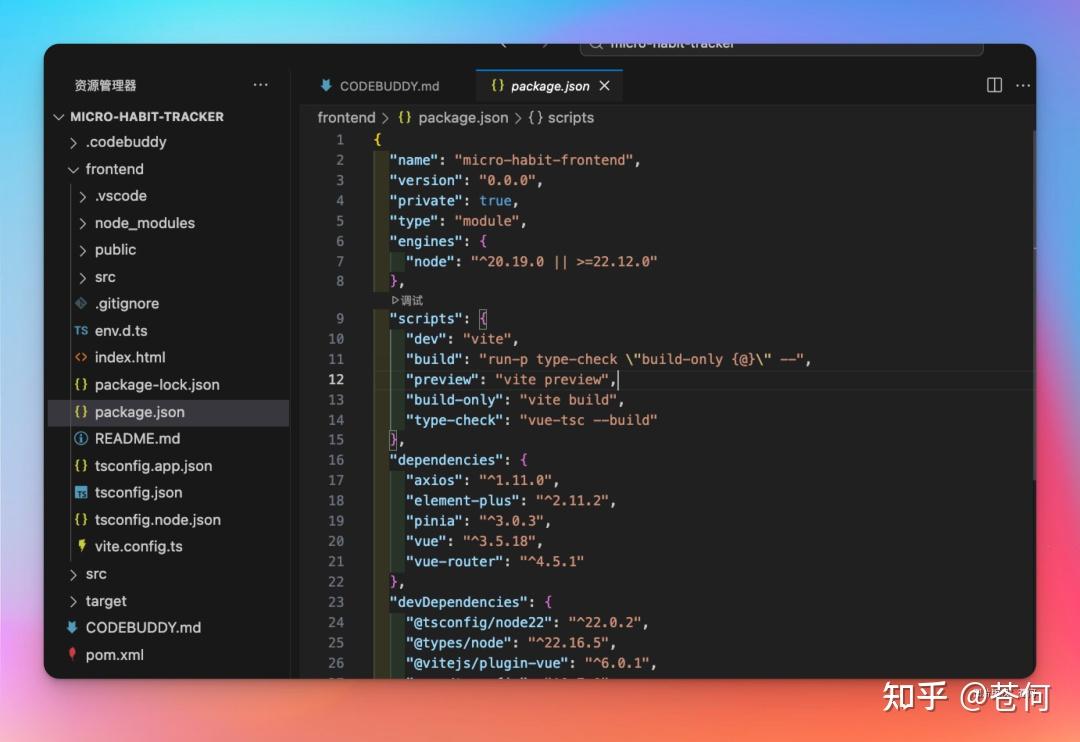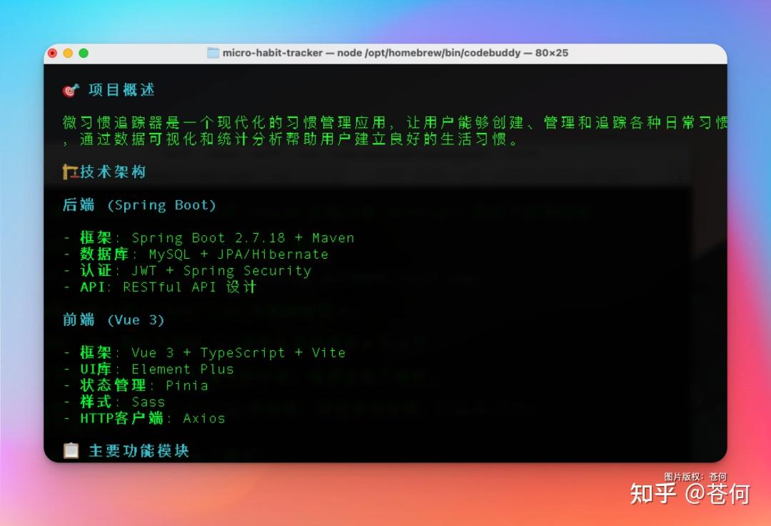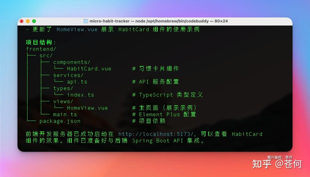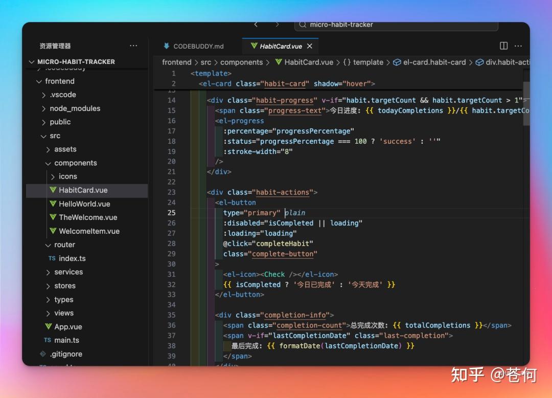 CodeBuddy Code 会提供所有命令行指令,并生成 HabitCard.vue 的完整代码,包括 props 定义、模板 HTML 结构和基本的样式。
