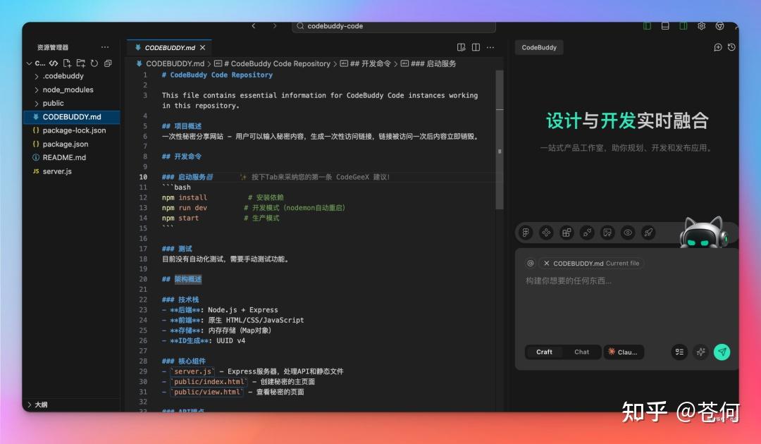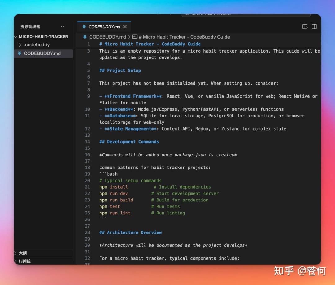 这时候打开 CODEBUDDY. md,可以看到,CodeBuddy Code 将项目概述、架构信息和开发注意事项都写清楚了。