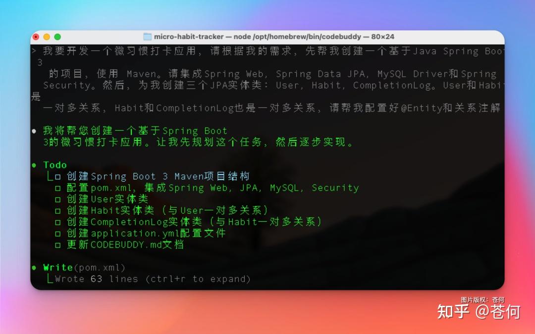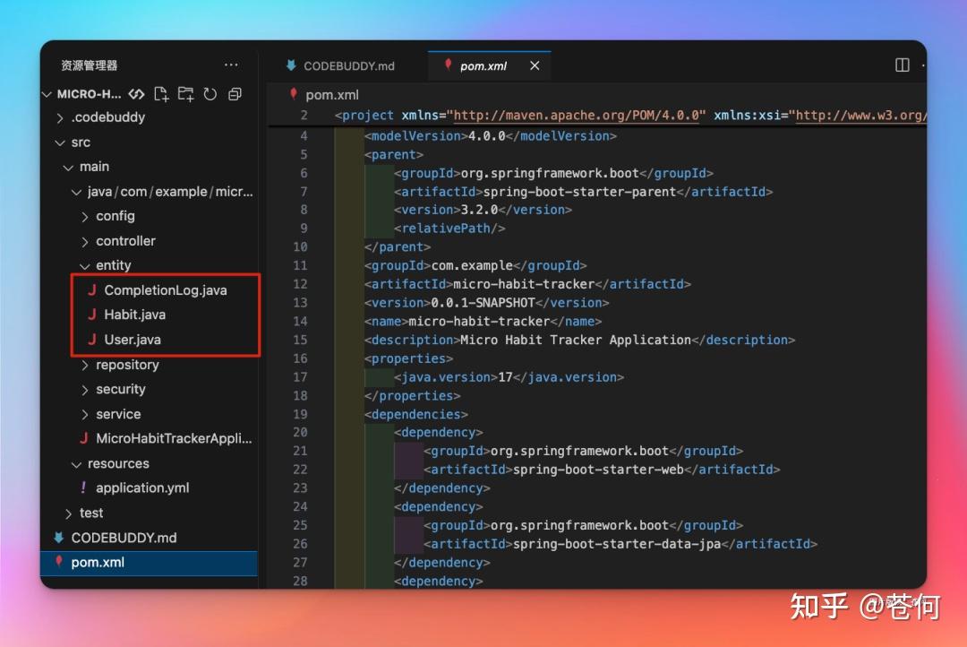 可以看到基于要求创建了 Spring Boot 应用,并做了实体类关系映射。而且立刻生成完整的 pom.xml 依赖配置,并创建好三个带有正确@ManyToOne, @OneToMany, @Column等注解的Java类。