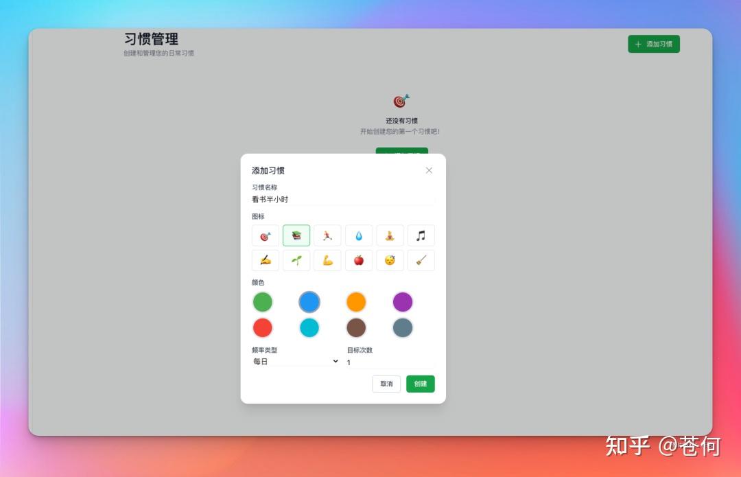 创建 (Create): 登录后,用户可以添加新的习惯(如:习惯名称、图标、目标频率等)。
