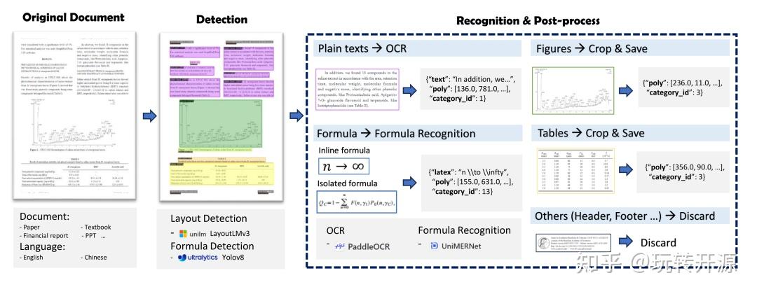 - 布局检测:使用LayoutLMv3模型进行区域检测,如图像,表格,标题,文本等;