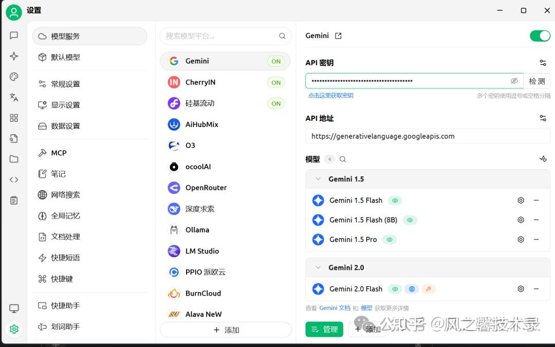 打开cherry studio客户端,点击设置,找到gemini这个平台,点击获取秘钥