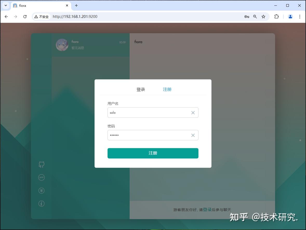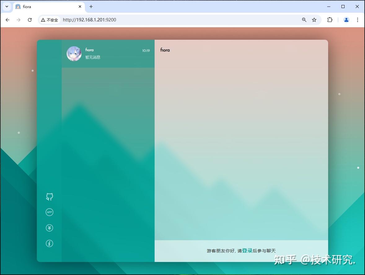 4,已经安装成功,Fiora 的默认端口是9200,所以在浏览器输入 http://本地IP:9200,就可以看到 Fiora 的主界面了。点击下面的登录按钮。