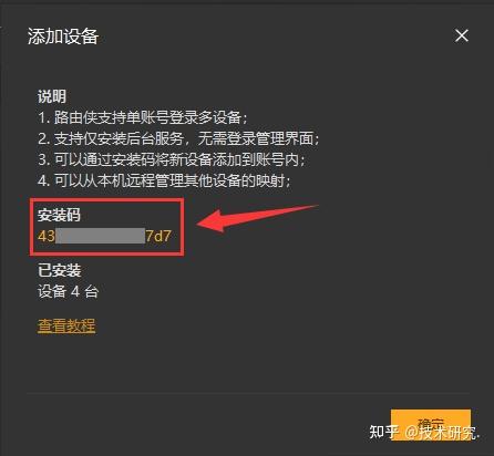 2,在路由侠客户端主界面,进入“设备管理”,点击右下角的“添加设备”,此时可查看到对应的安装码,此安装码用于将设备添加到对应账号下,可选中后复制。