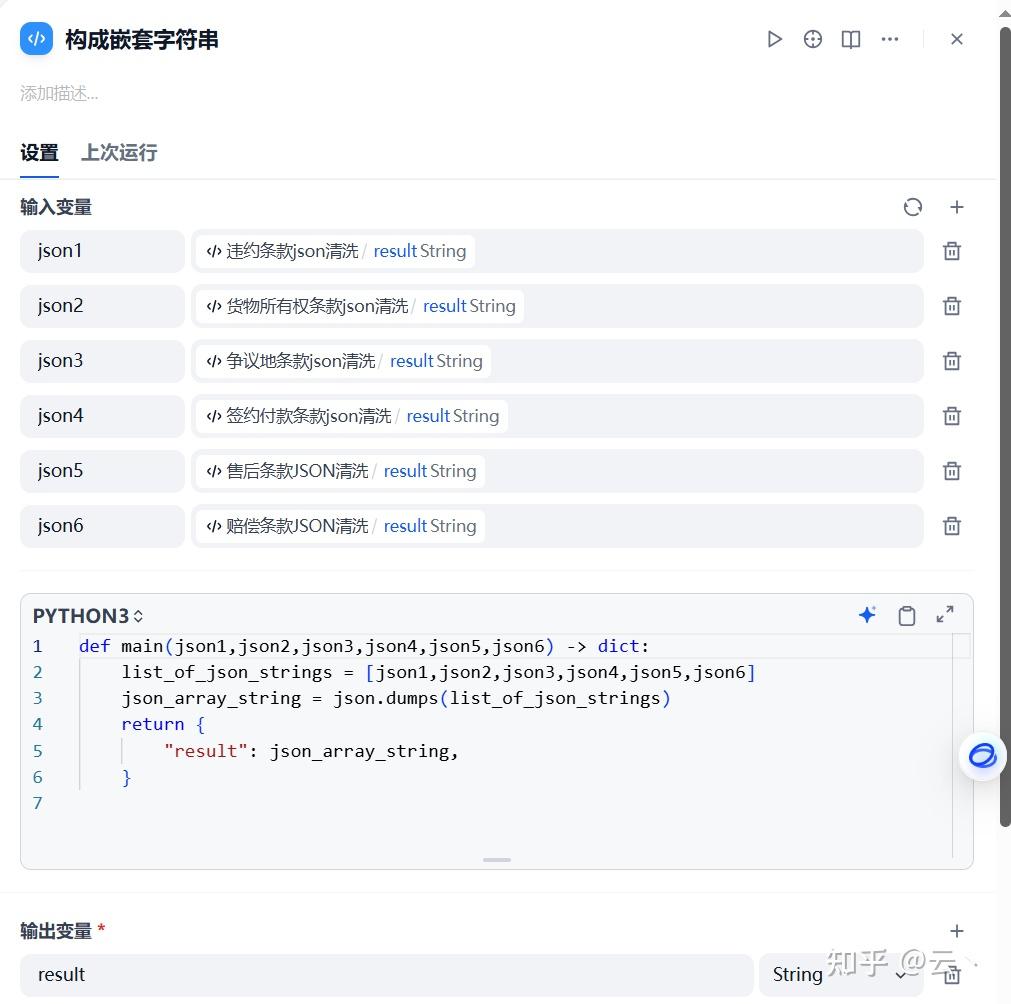 通过各个审查节点的处理我们最终得到了六个角度的审查结果,我们通过【代码】节点清洗内容,最终构成嵌套字符串。各部分的代码实现见下图。