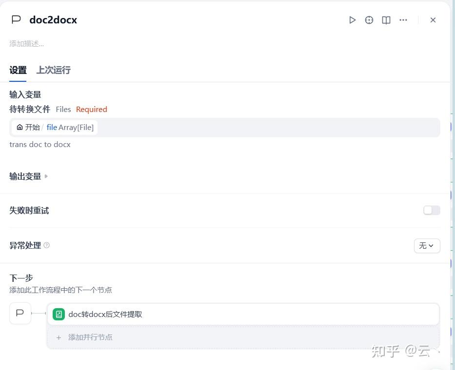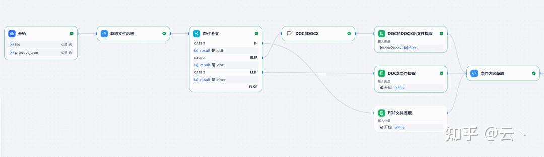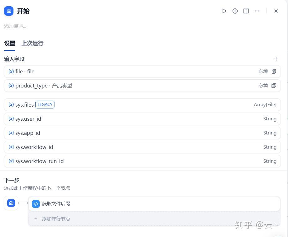 首先是对用户上传合同文件的处理,这里处理的主要目的是提取出文件的内容。在【开始】节点我们自定义了“file”和“product_type”两个参数,分别是用户上传的合同文件以及合同中设计的采购产品类型。