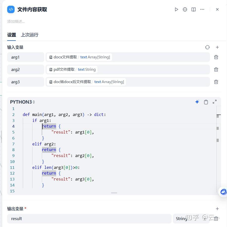 通过文件提取这一步骤之后,我们使用【代码】节点将三个分支内容进行参数聚合,获取真正包含文件内容的分支的数据。代码节点的脚本如下: