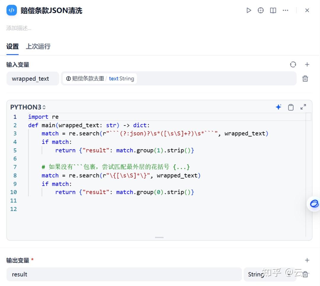 售后部分和其他节点有一些区别,因为不同的产品对应的售后条款不同,所以针对这一点,我们使用【代码】节点结合【开始】节点中的“product_type”进行判断,然后将需要遵守的售后规则传入【售后条款审核】节点。