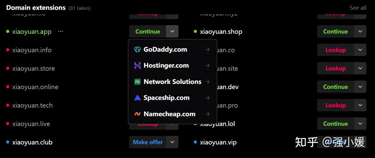 - 发现替代方案:如果想要的 .com 已经被占了,它会给出一堆其他后缀或类似拼写的可选域名。