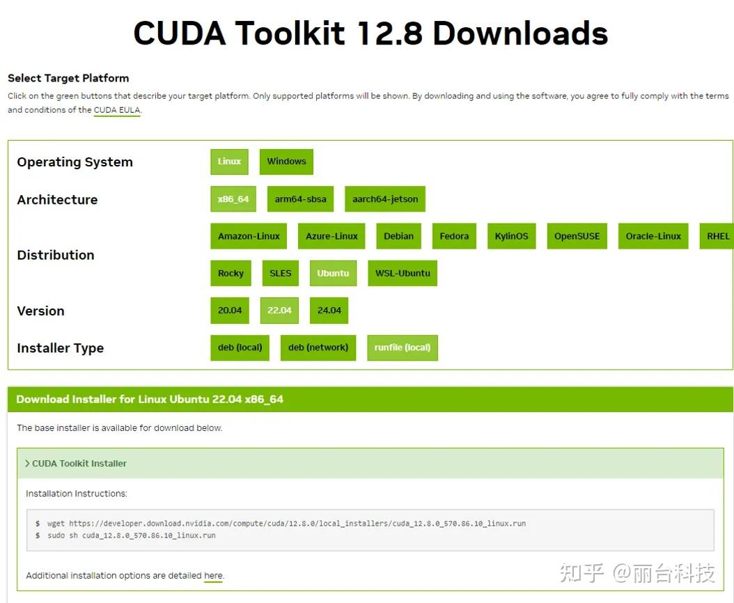 根据提示,选择对应系统版本,获取 CUDA 工具包安装程序下载链接以及安装方式。