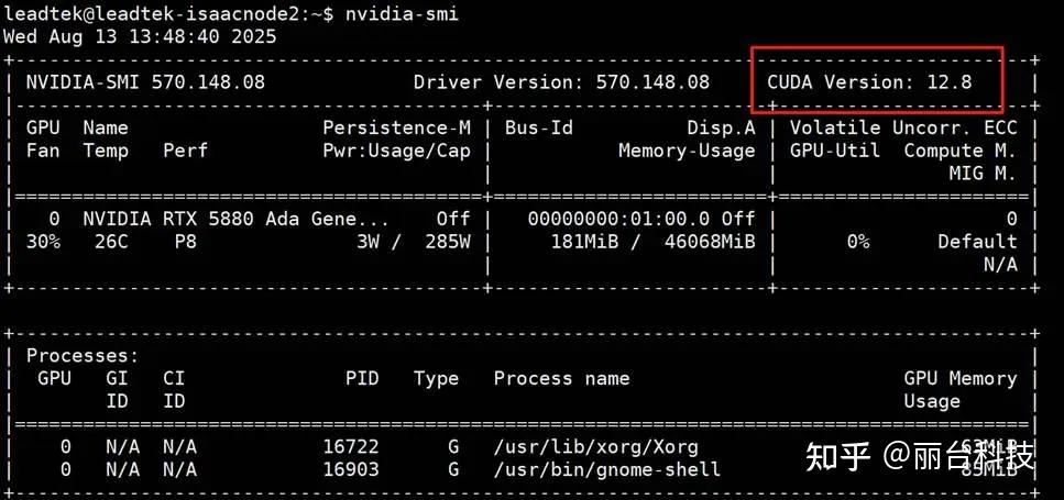 1.1 使用 nvidia-smi 查看当前驱动支持的最高 cuda 版本。如下图所示,可以看到当前显示最高版本为 CUDA Version:12.8。